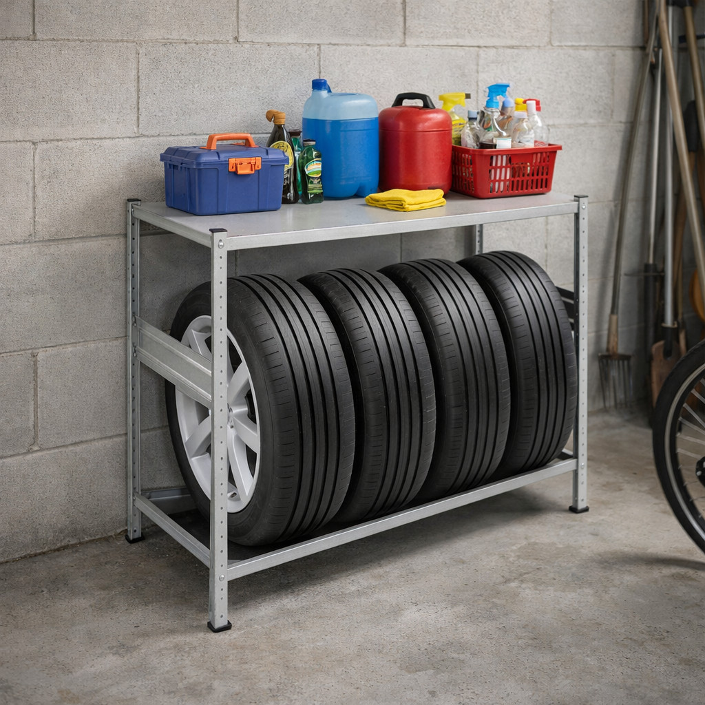 Organisieren Sie Ihre Garage effizienter und schaffen Sie mehr Platz mit einem praktischen Reifenregal. Dieses Modell mit einer Breite von 1060 mm und einer Höhe von 1100 mm bietet ausreichend Platz für die sichere Lagerung von 4 Reifen mit oder ohne Felgen und gleichzeitig zusätzliche Ablagefläche für Dinge, die Sie in der Garage regelmäßig benötigen. Dank seiner Höhe kann die obere Fläche auch als praktische Arbeitsfläche genutzt werden, auf der Sie Werkzeuge, Teile oder Material während der Arbeit bequem ablegen können.