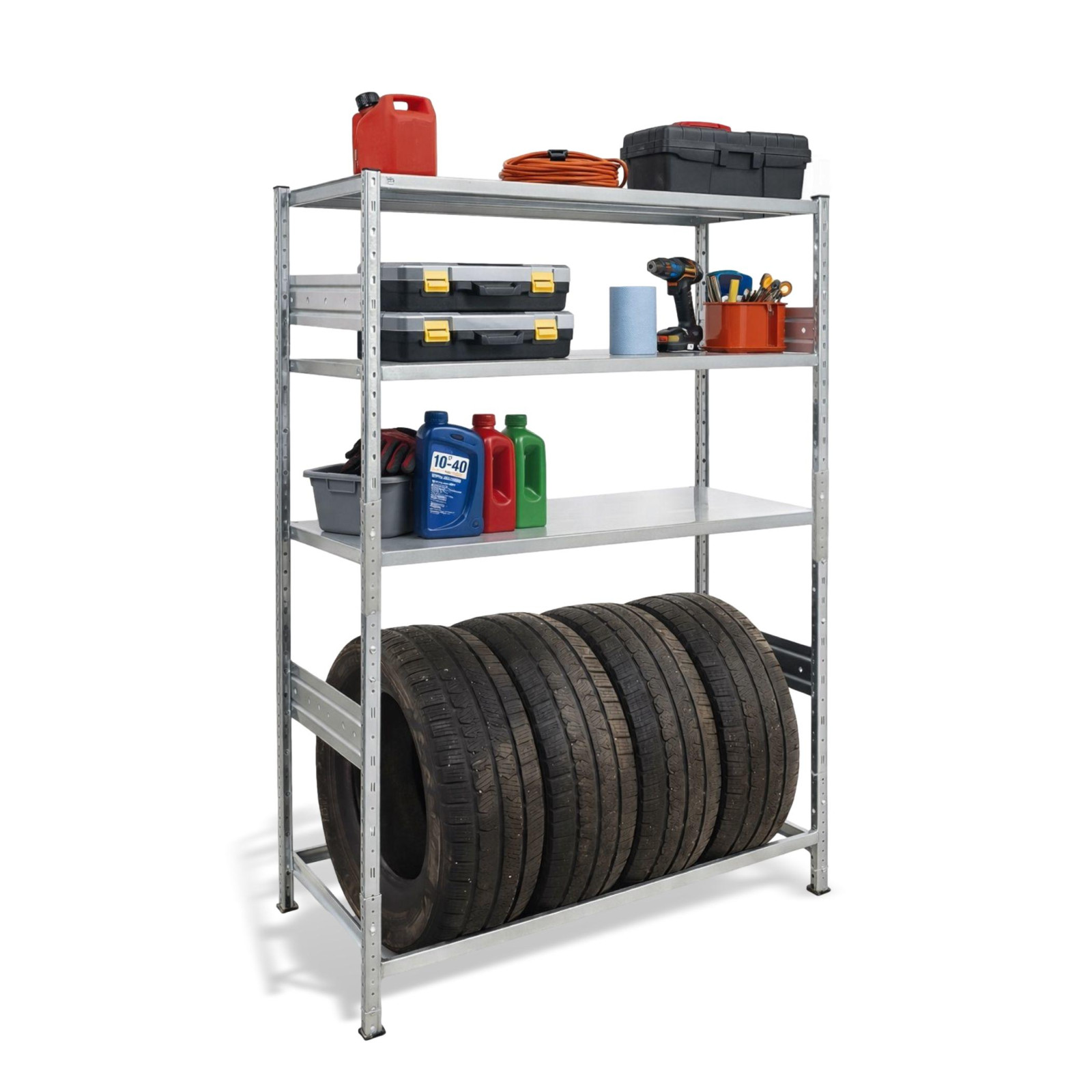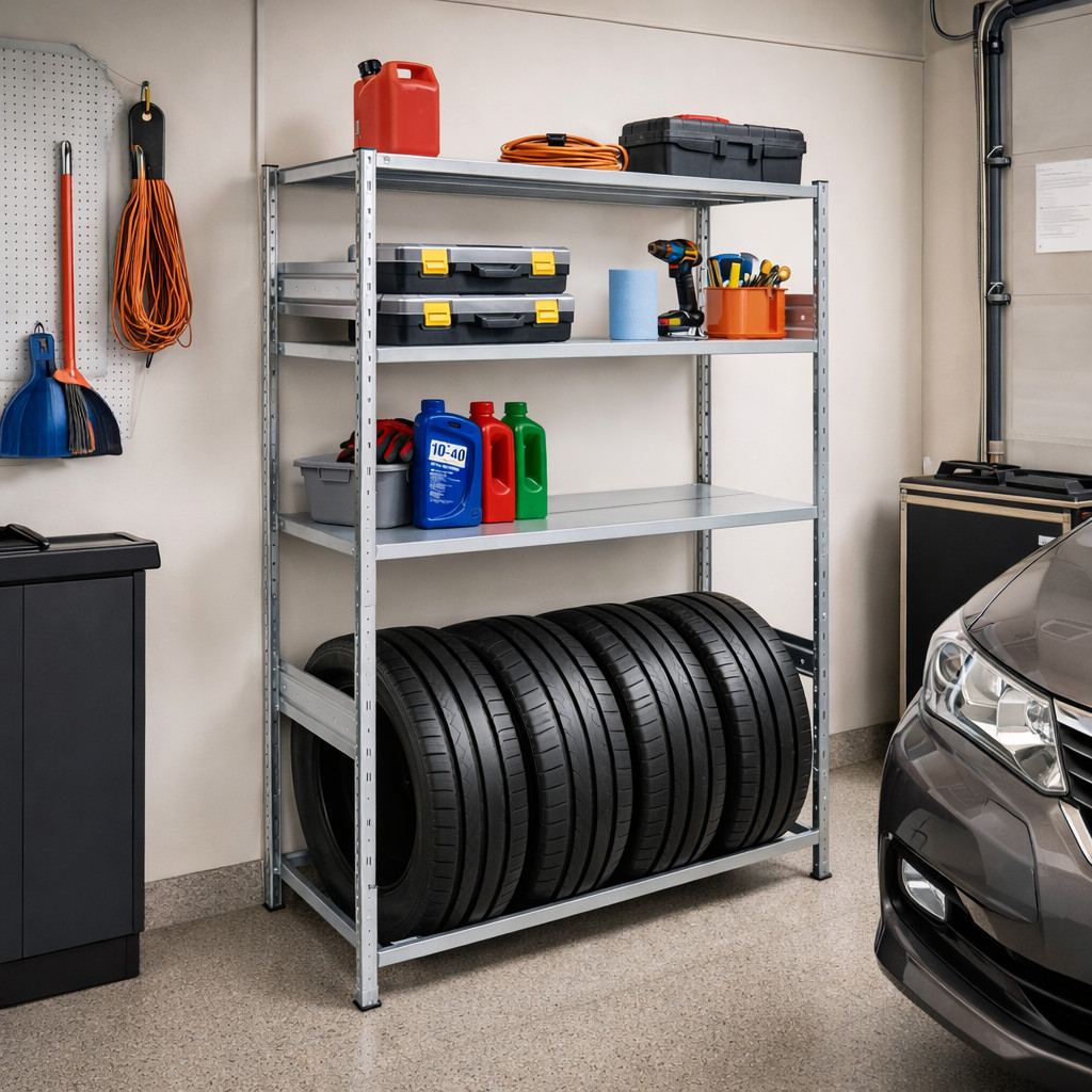 Die stabile Metallkonstruktion sorgt für eine hohe Standfestigkeit – das Regal verbiegt sich nicht und bleibt auch bei größerer Belastung zuverlässig stabil. Dadurch eignet es sich nicht nur für private Garagen, sondern auch für Autowerkstätten, Reifenservices oder Werkstätten.