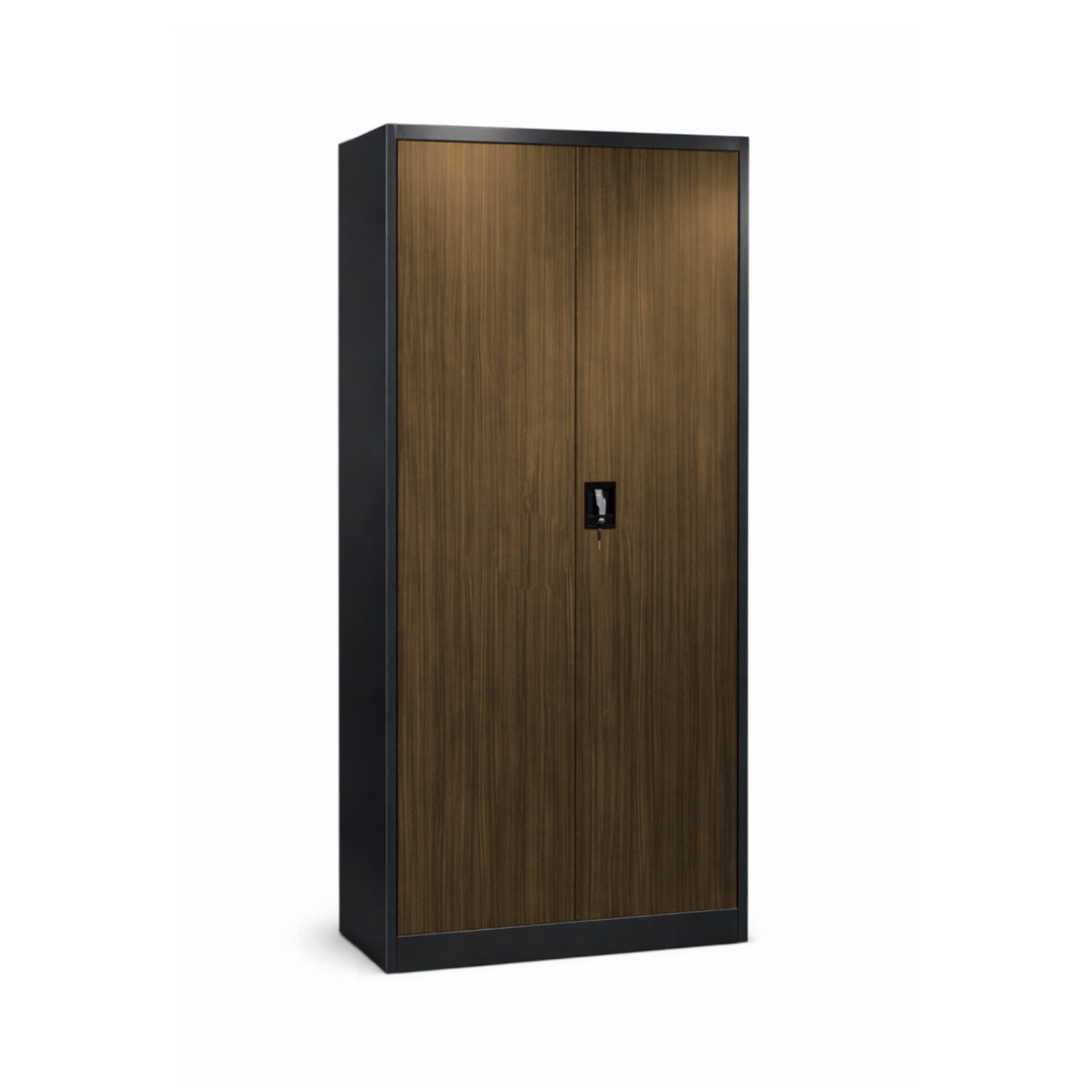 Der Büroschrank in Kombination aus anthrazitfarbenem Korpus und Türen in dunkler Holzoptik stellt die ideale Lösung für alle dar, die einen zuverlässigen, langlebigen und zugleich optisch ansprechenden Stauraum suchen. Dank seines modernen Designs wirkt er repräsentativ und fügt sich problemlos in Büros, Managementbereiche, Besprechungsräume sowie Homeoffices ein.