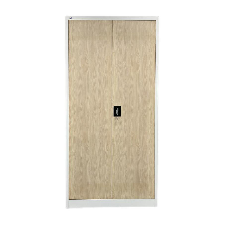 Der Korpus und das Innere des Schranks sind in der Farbe RAL 9003 – Signalweiß ausgeführt. Die Außenseite der Türen ist im Dekor einer hellen Holzoptik, während die Innenseite der Türen in hellem Elfenbein gehalten ist, was einen interessanten und modernen visuellen Eindruck erzeugt.
