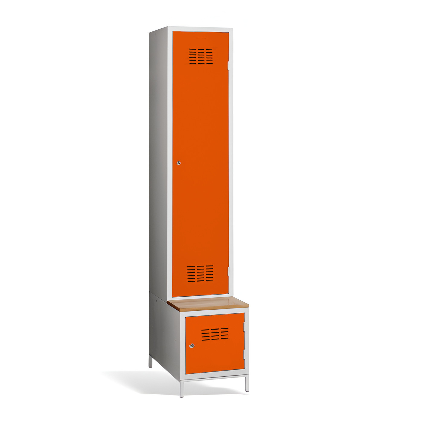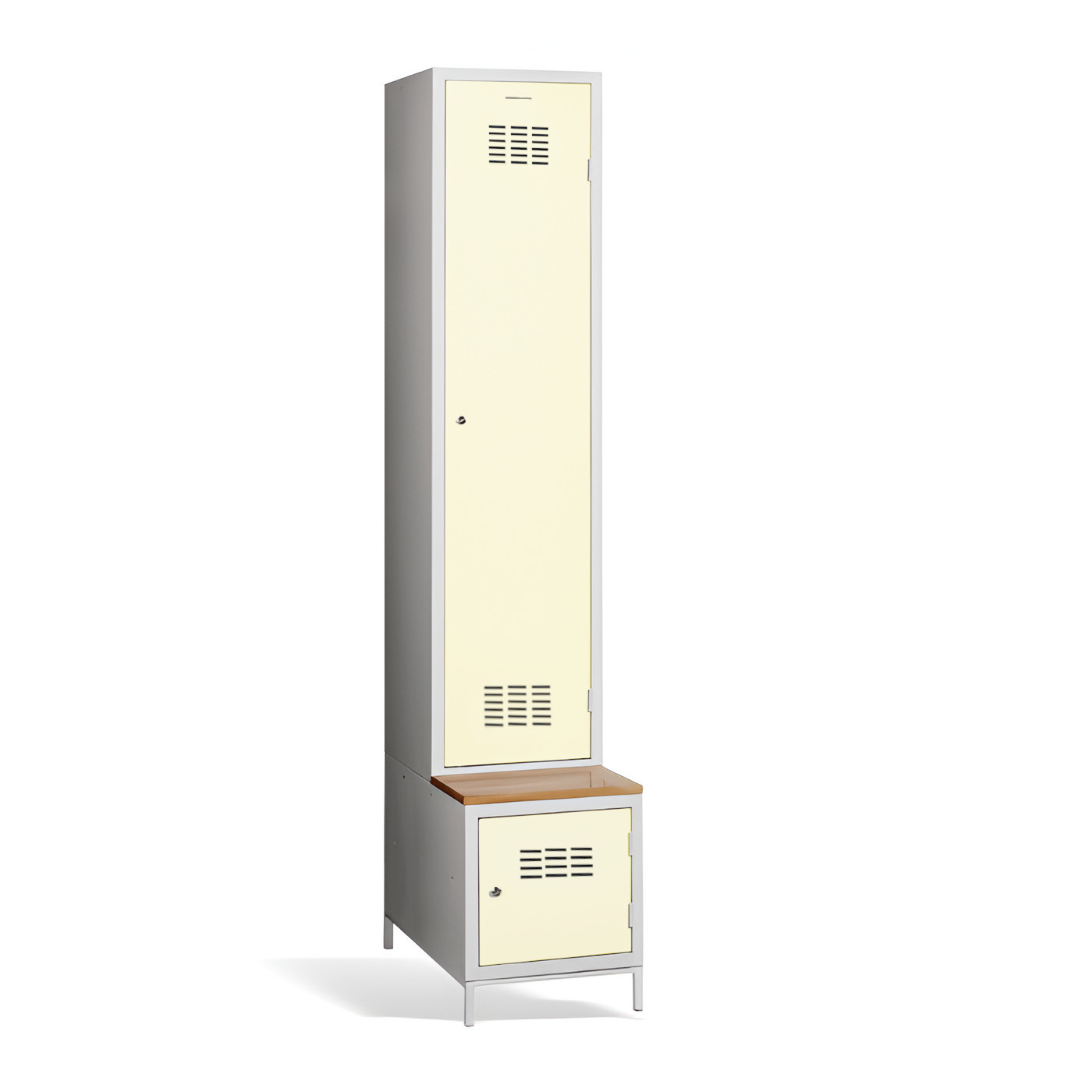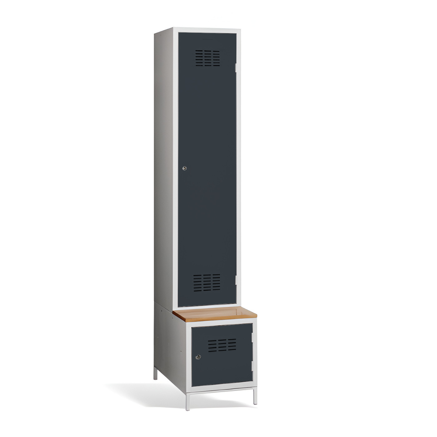 Der 1-türige Kleiderschrank #03 MAXI 1 PLUS mit Trennwand, eingebauter Bank und Schuhschrank ist die ideale Lösung für die Garderobe. Er ist die bequemste Lösung um Komfort und Ordnung in der Garderobe zu gewährleisten. Dank der Trennwand können Sie ihn auch zur Trennung von Arbeits- und Privatkleidung nutzen. Die hellgraue Metallgarderobe hat eine geschweißte Konstruktion und ist aus hochwertigem, beschichtetem Stahlblech der Güteklasse 1 gefertigt. Die Garderobe bietet reichlich Platz, Sie können darin bequem Ihre Kleidung, Accessoires und andere persönliche Gegenstände zu verstauen. Die Türbelüftung im oberen und unteren Teil sorgt für eine gute Luftzirkulation. Der #03 MAXI 1 PLUS wird standardmäßig mit einem Sicherheitszylinderschloss geliefert, aber Sie können aus einer Vielzahl von Schlössern wählen, die Ihren Anforderungen entsprechen.