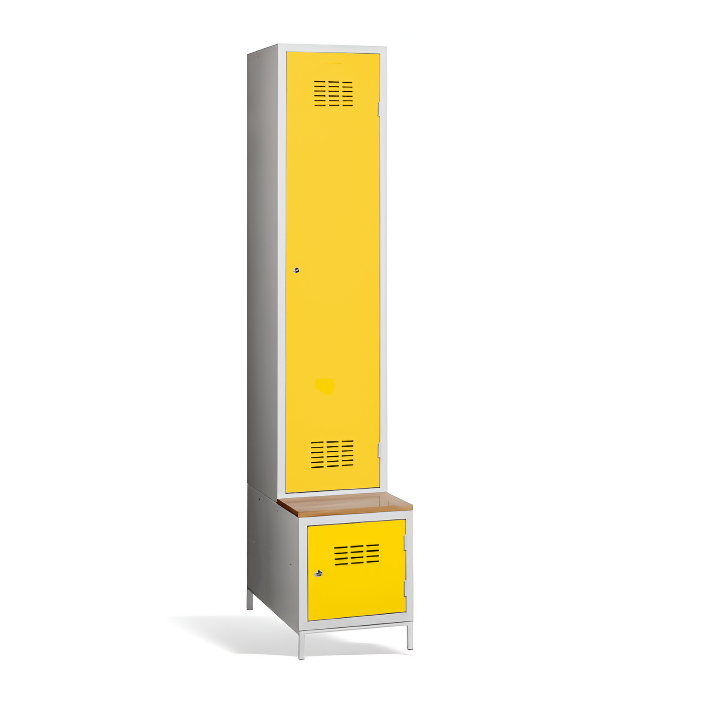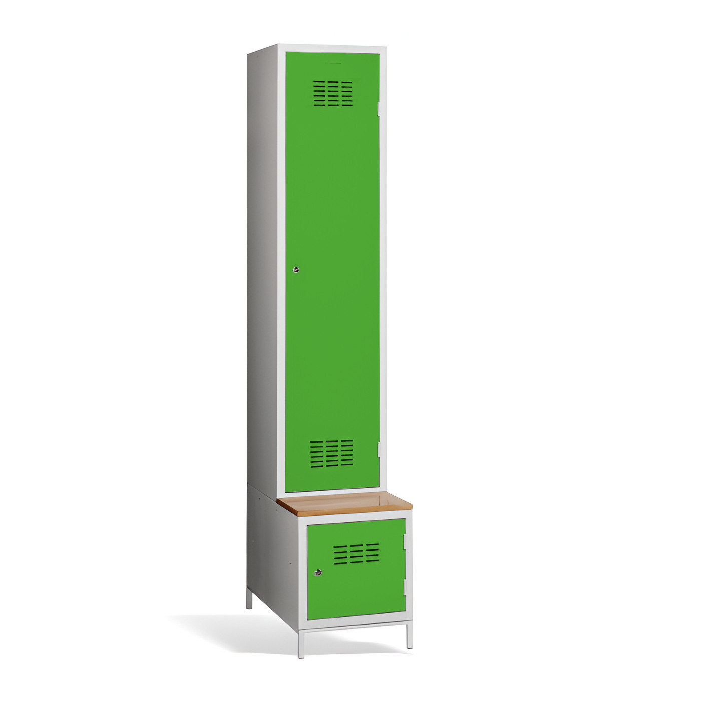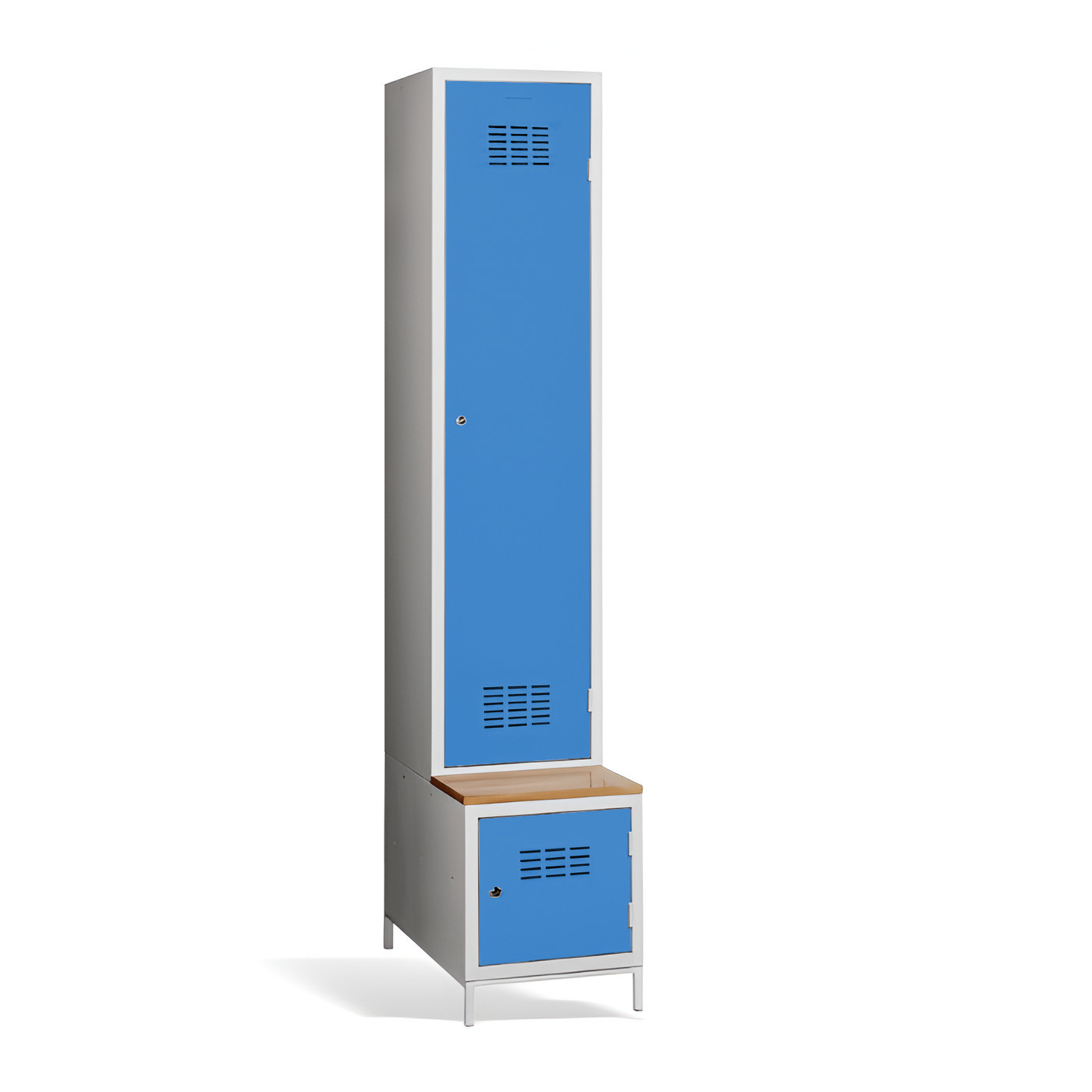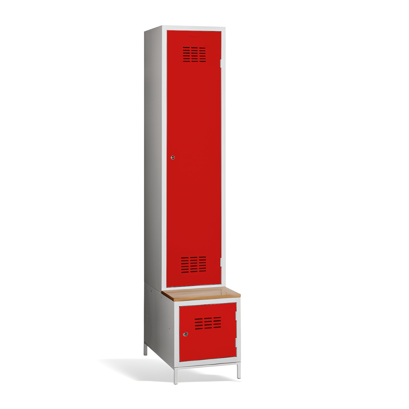 Der 1-türige Kleiderschrank #03 MAXI 1 PLUS mit Trennwand, eingebauter Bank und Schuhschrank ist die ideale Lösung für die Garderobe. Er ist die bequemste Lösung um Komfort und Ordnung in der Garderobe zu gewährleisten. Dank der Trennwand können Sie ihn auch zur Trennung von Arbeits- und Privatkleidung nutzen. Die hellgraue Metallgarderobe hat eine geschweißte Konstruktion und ist aus hochwertigem, beschichtetem Stahlblech der Güteklasse 1 gefertigt. Die Garderobe bietet reichlich Platz, Sie können darin bequem Ihre Kleidung, Accessoires und andere persönliche Gegenstände zu verstauen. Die Türbelüftung im oberen und unteren Teil sorgt für eine gute Luftzirkulation. Der #03 MAXI 1 PLUS wird standardmäßig mit einem Sicherheitszylinderschloss geliefert, aber Sie können aus einer Vielzahl von Schlössern wählen, die Ihren Anforderungen entsprechen.