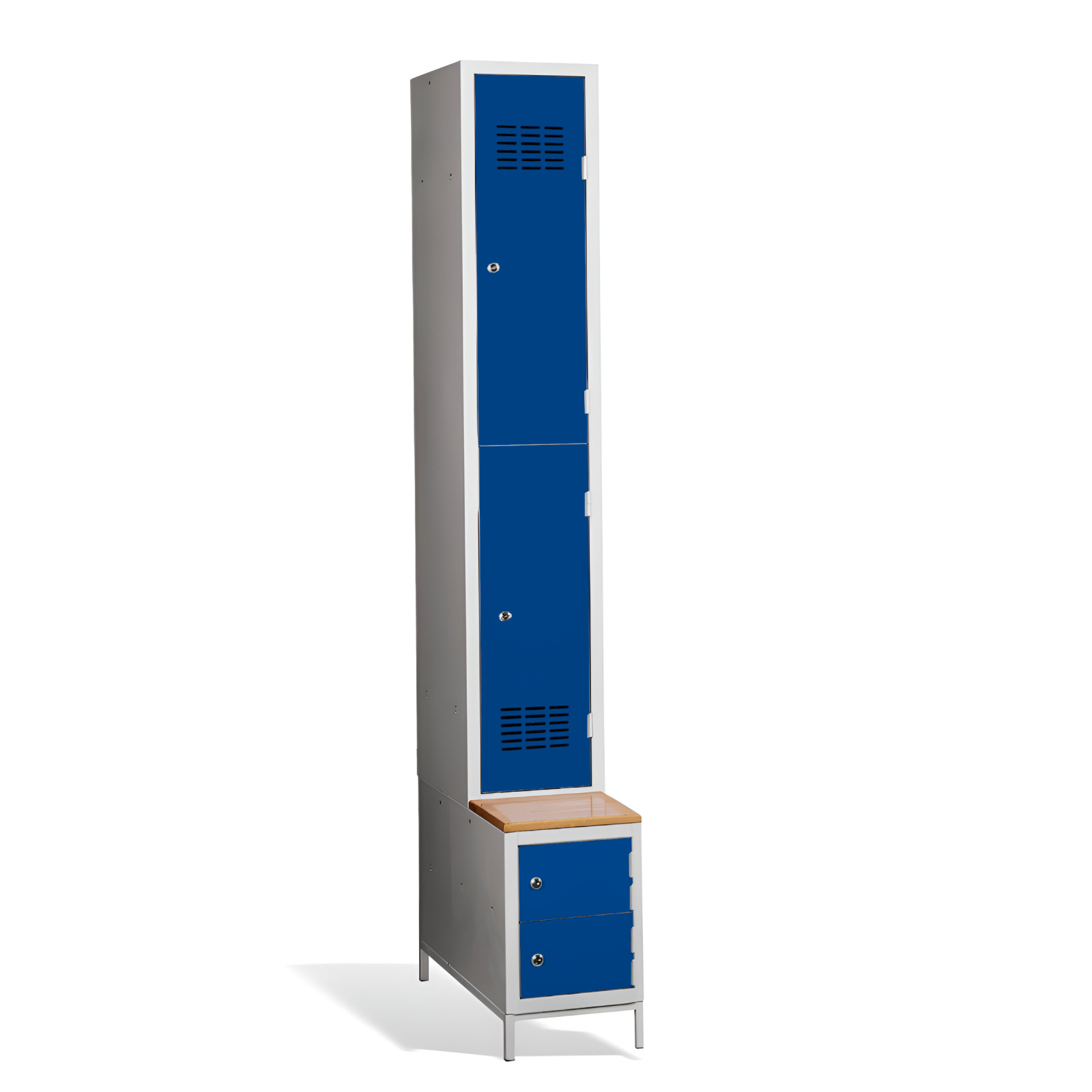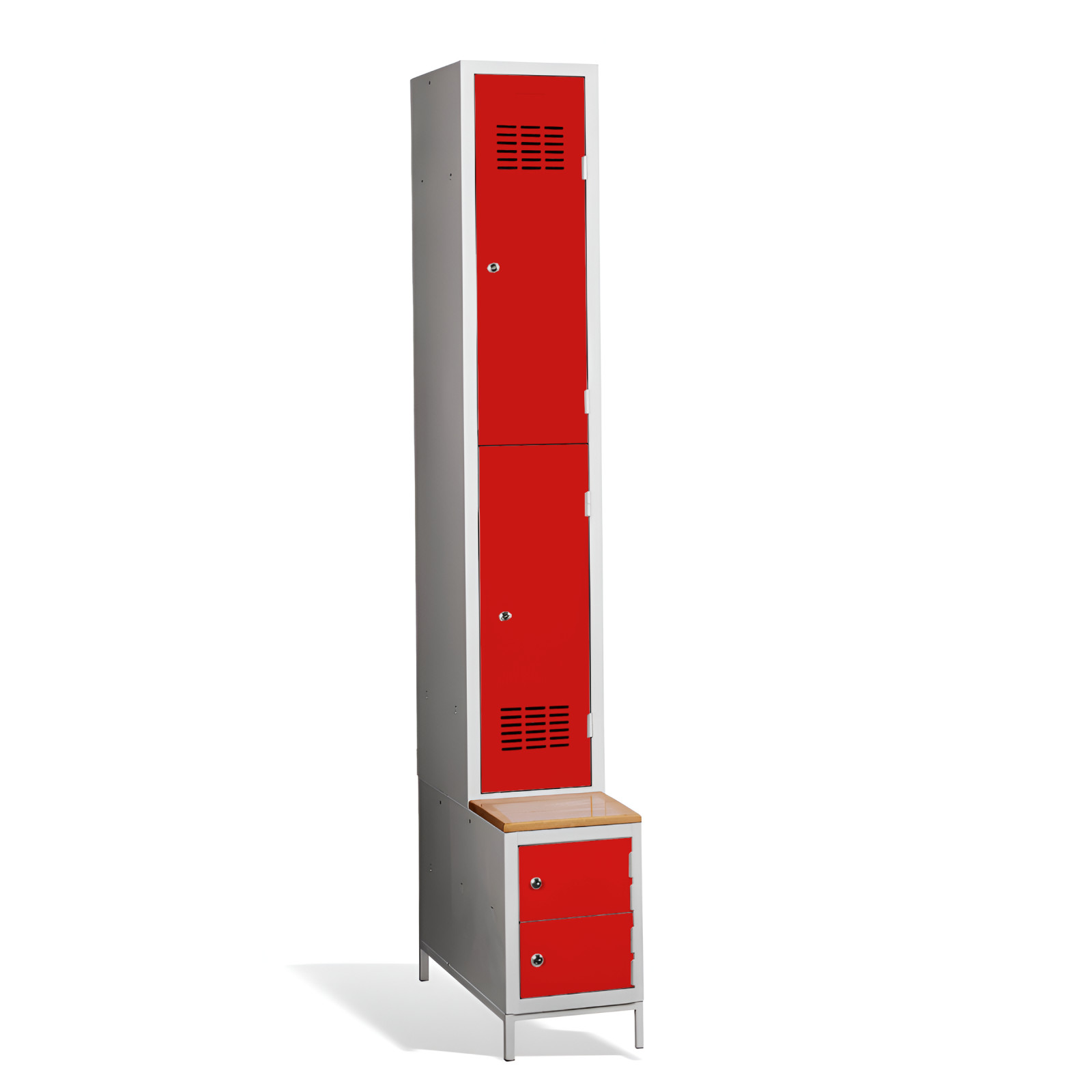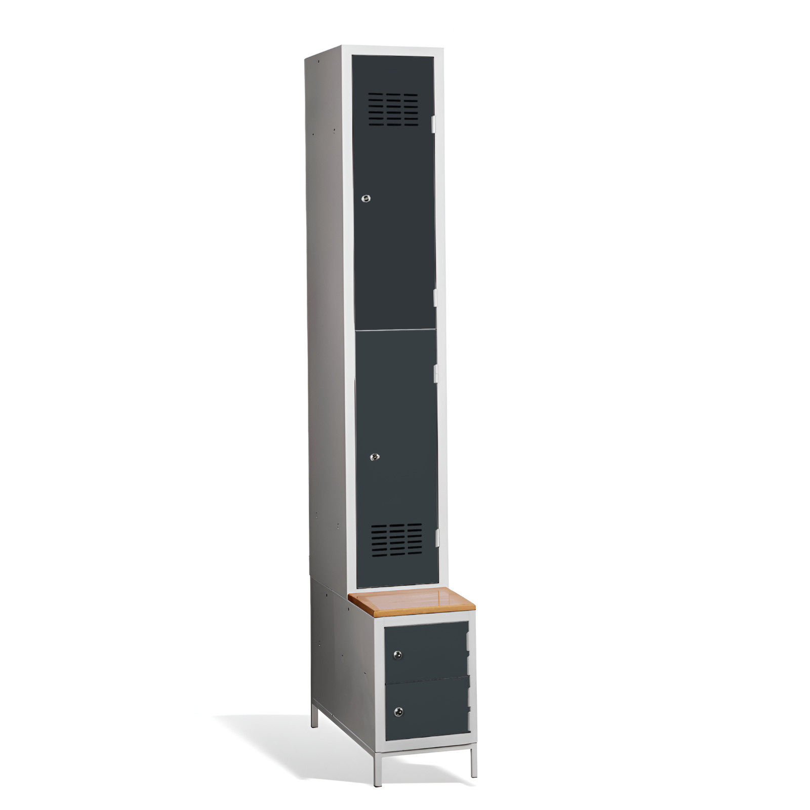 Wenn Sie auf der Suche nach einer umfassenden Lösung für Ihre Garderobe sind, ist der #03 MINI 2 PLUS die perfekte Wahl für Sie! Der 2-türige Kleiderschrank mit kurzen Türen bietet ausreichend Stauraum für 2 Personen: er verfügt über eine eingebaute Bank und einen Schuhschrank für mehr Komfort und Ordnung. Die Konstruktion des Schranks ist geschweißt und aus hochwertigem, beschichtetem Stahlblech der Güteklasse 1 gefertigt. Der #03 MINI 2 PLUS ist serienmäßig mit einem Sicherheitszylinderschloss ausgestattet, aber Sie können aus einer Vielzahl von Schlössern wählen, die Ihren Anforderungen entsprechen.