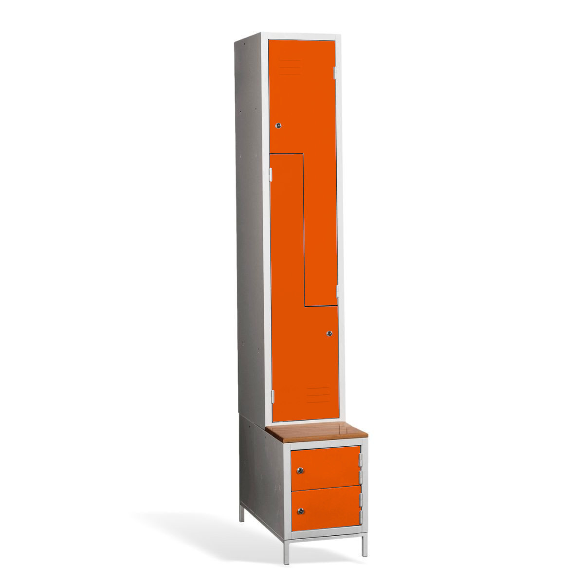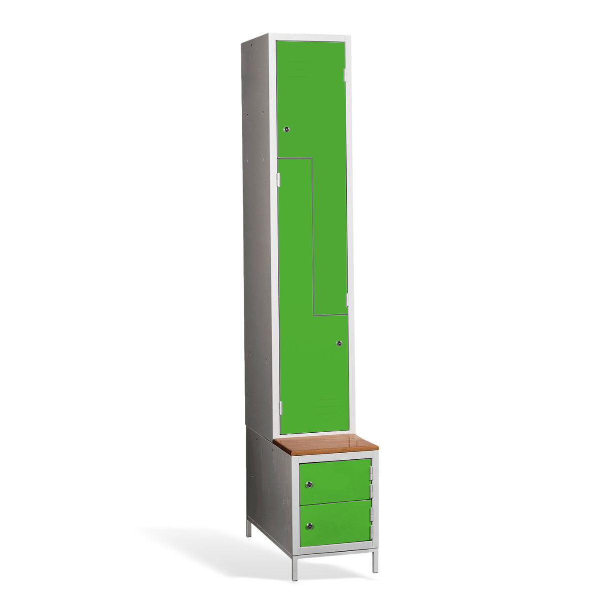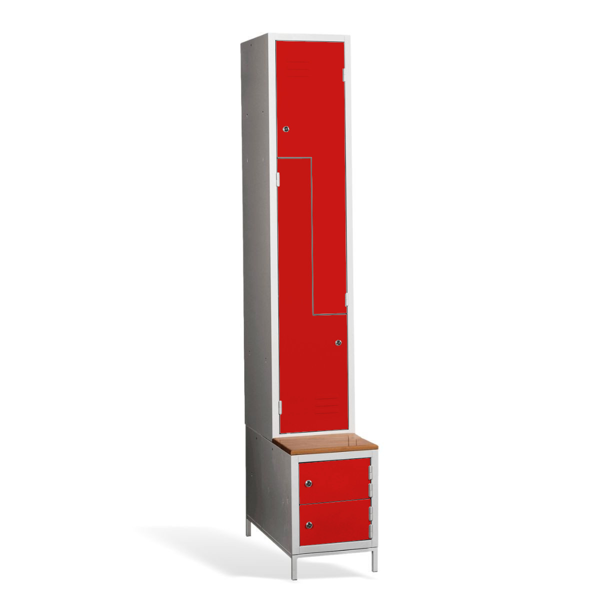 Der 2-türige Kleiderschrank mit Z-Flügeltüren, mit eingebauter Bank und Schuhfächern ist die ideale Lösung für die Garderobe. Er ist die bequemste Lösung, um Komfort und Ordnung in der Garderobe zu gewährleisten. Die Konstruktion der Garderobe ist geschweißt und besteht aus beschichtetem Stahlblech der Güteklasse 1. Das Z-förmige Design der Garderobe ist platzsparend und bietet dennoch ausreichend Komfort. Dieser Schrank ist eine ideale Wahl für einen Umkleideraum in einer Schule, einem Unternehmen oder einer Sporteinrichtung. Der #03 CIK-CAK MINI 2 PLUS wird standardmäßig mit einem Sicherheitszylinderschloss geliefert, aber Sie können aus verschiedenen Schlössern nach Ihrem Wunsch wählen. Sie können jedoch aus einer Vielzahl von Schlössern wählen, die Ihren Anforderungen entsprechen.