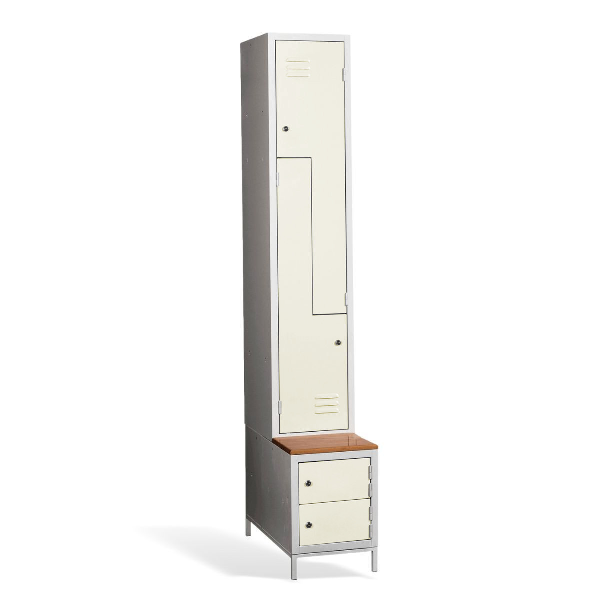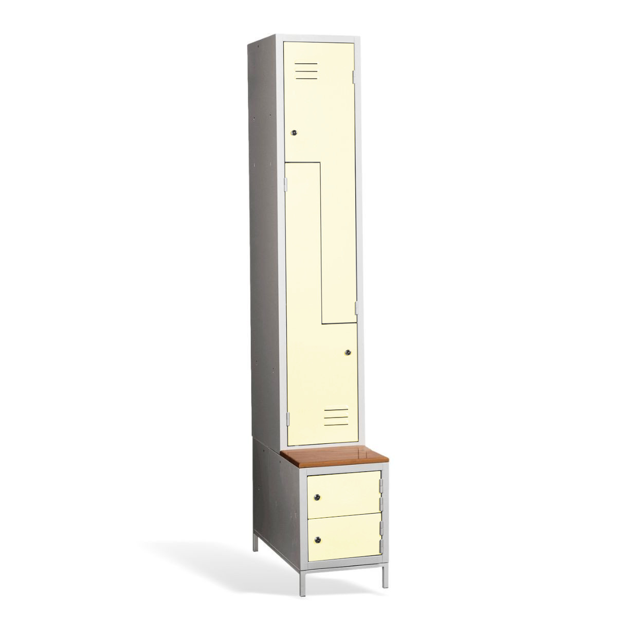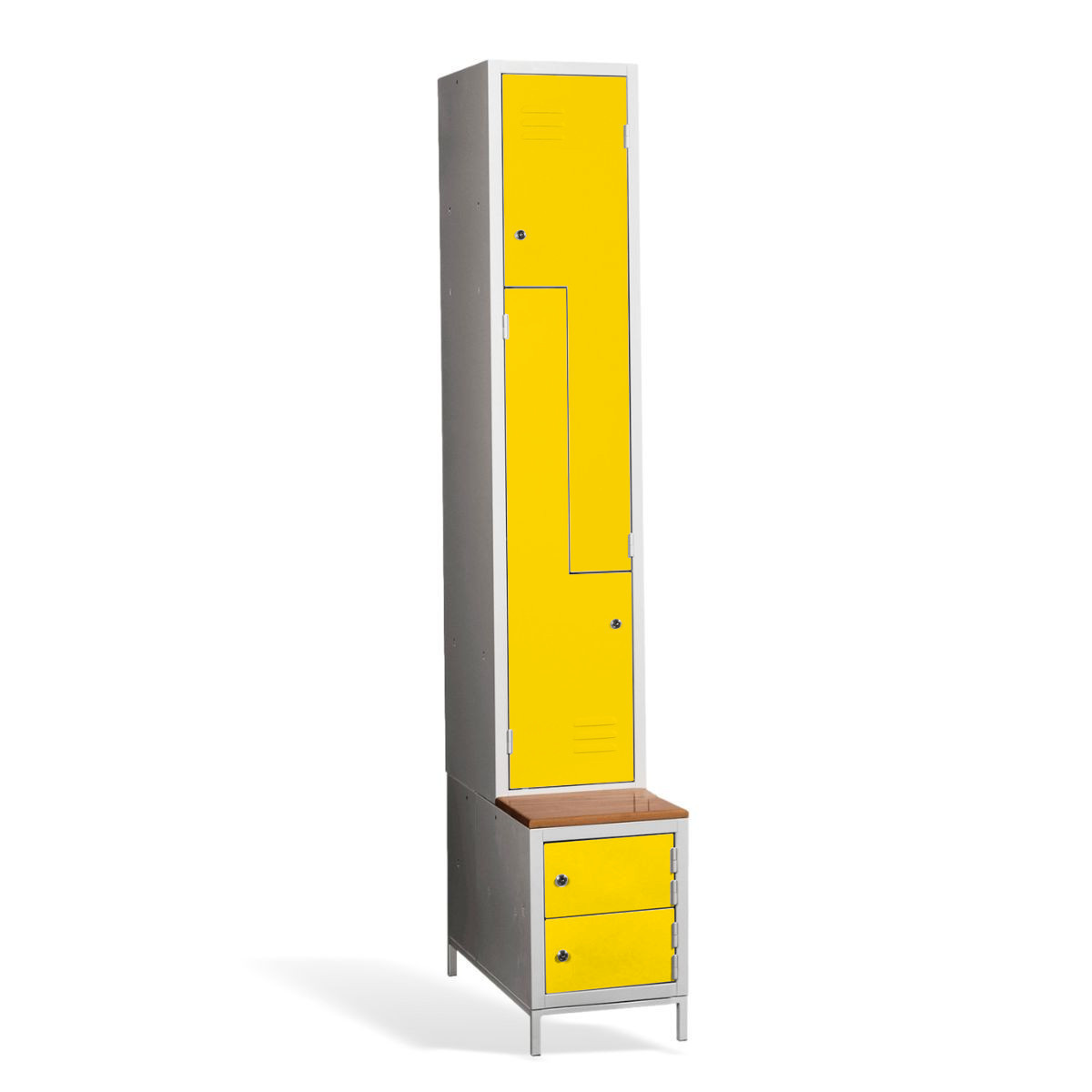 Der 2-türige Kleiderschrank mit Z-Flügeltüren, mit eingebauter Bank und Schuhfächern ist die ideale Lösung für die Garderobe. Er ist die bequemste Lösung, um Komfort und Ordnung in der Garderobe zu gewährleisten. Die Konstruktion der Garderobe ist geschweißt und besteht aus beschichtetem Stahlblech der Güteklasse 1. Das Z-förmige Design der Garderobe ist platzsparend und bietet dennoch ausreichend Komfort. Dieser Schrank ist eine ideale Wahl für einen Umkleideraum in einer Schule, einem Unternehmen oder einer Sporteinrichtung. Der #03 CIK-CAK MINI 2 PLUS wird standardmäßig mit einem Sicherheitszylinderschloss geliefert, aber Sie können aus verschiedenen Schlössern nach Ihrem Wunsch wählen. Sie können jedoch aus einer Vielzahl von Schlössern wählen, die Ihren Anforderungen entsprechen.