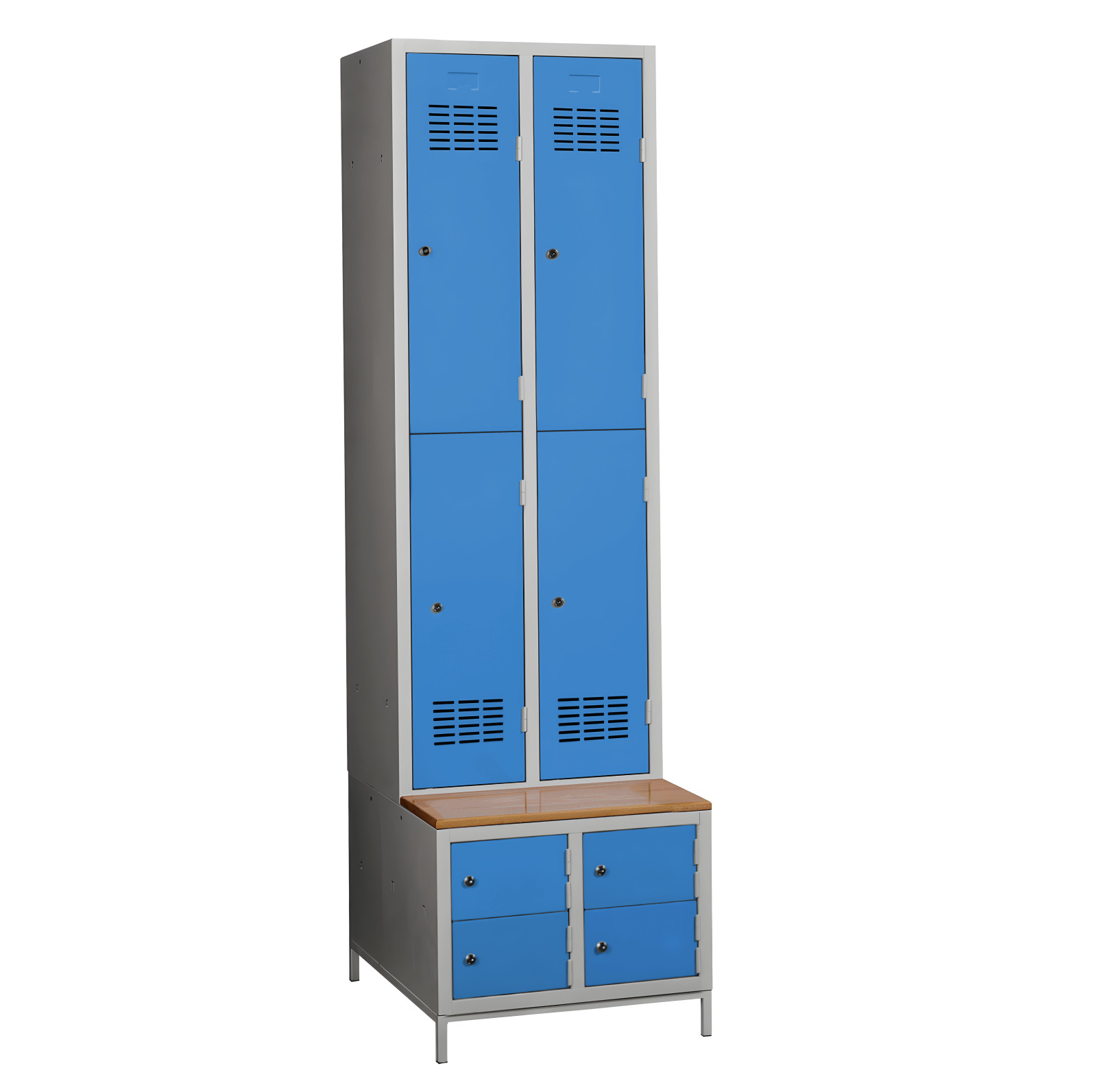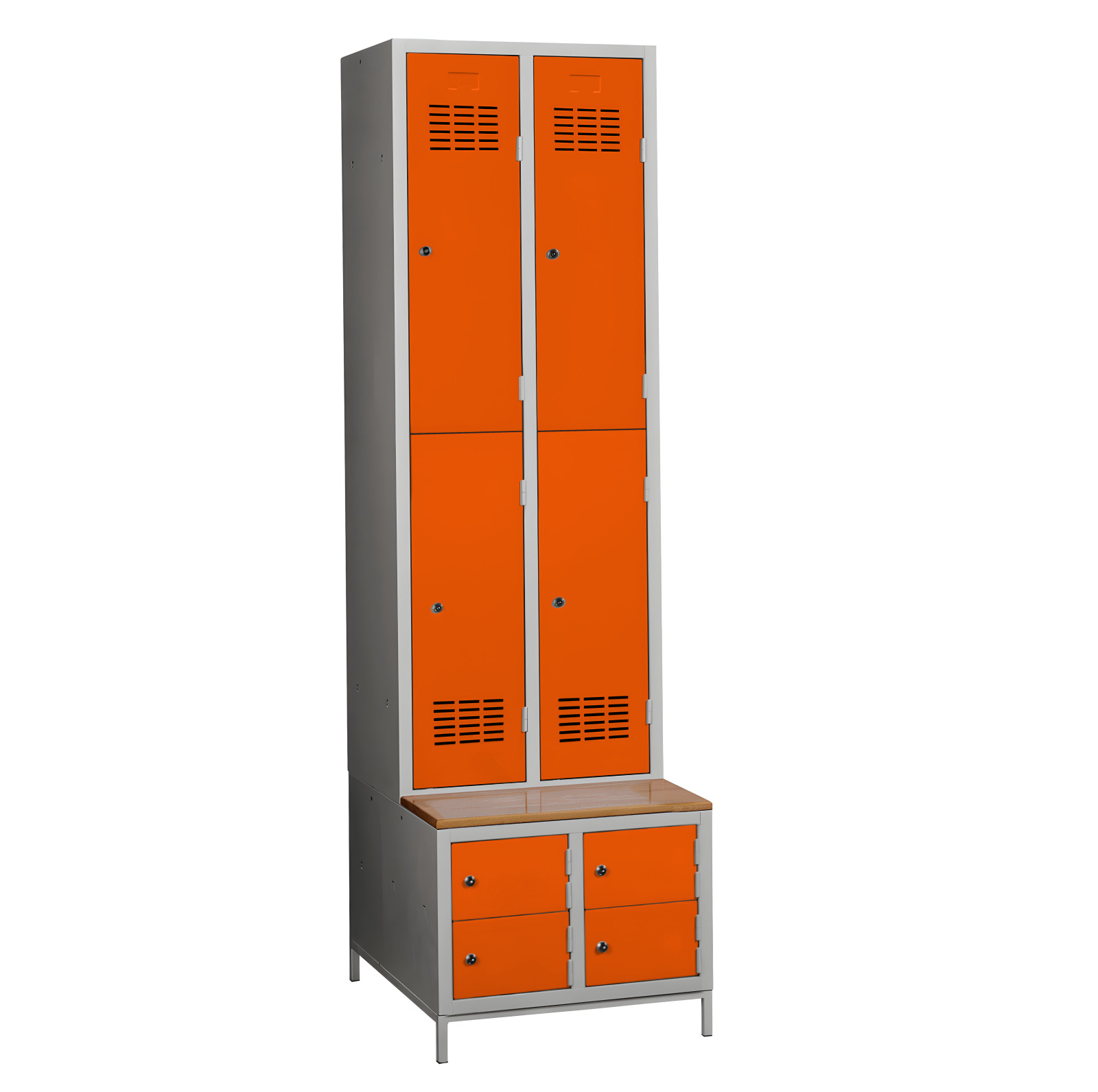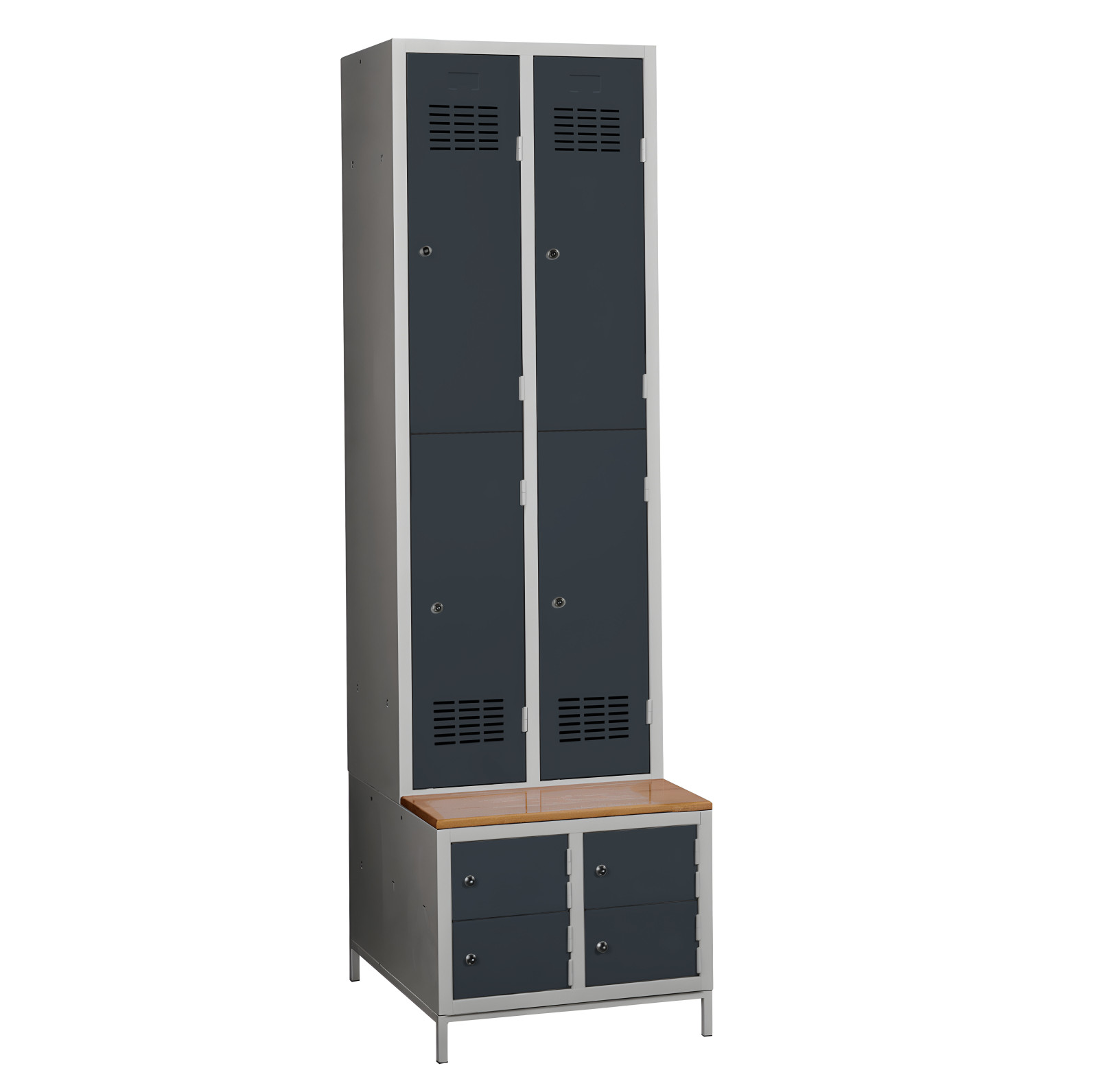 Die 3-in-1-Lösung: Der 4-türige Kleiderschrank mit kurzen Türen, eingebauter Bank und Schuhschränken ist die perfekte Lösung für die Garderobe. Er ist die bequemste Lösung um Komfort und Ordnung in der Garderobe zu gewährleisten. Die Konstruktion des Schranks ist aus hochwertigem, beschichtetem Stahlblech der Güteklasse 1 gefertigt. Geteilte Garderobenschränke sind bei unseren Kunden sehr beliebt, da sie viel Stauraum für mehrere Personen bieten und dabei wenig Platz benötigen. Dieser Schrank ist nur 600 mm breit und enthält 8 Fächer für 4 Personen. Der #03 MINI 4 PLUS wird standardmäßig mit einem Sicherheitszylinderschloss geliefert, aber Sie können aus einer Vielzahl von Schlössern wählen, die Ihren Anforderungen entsprechen.
