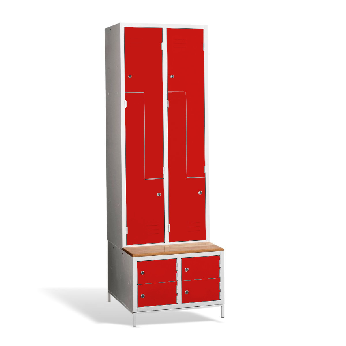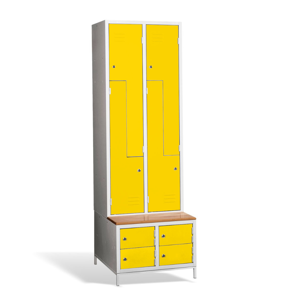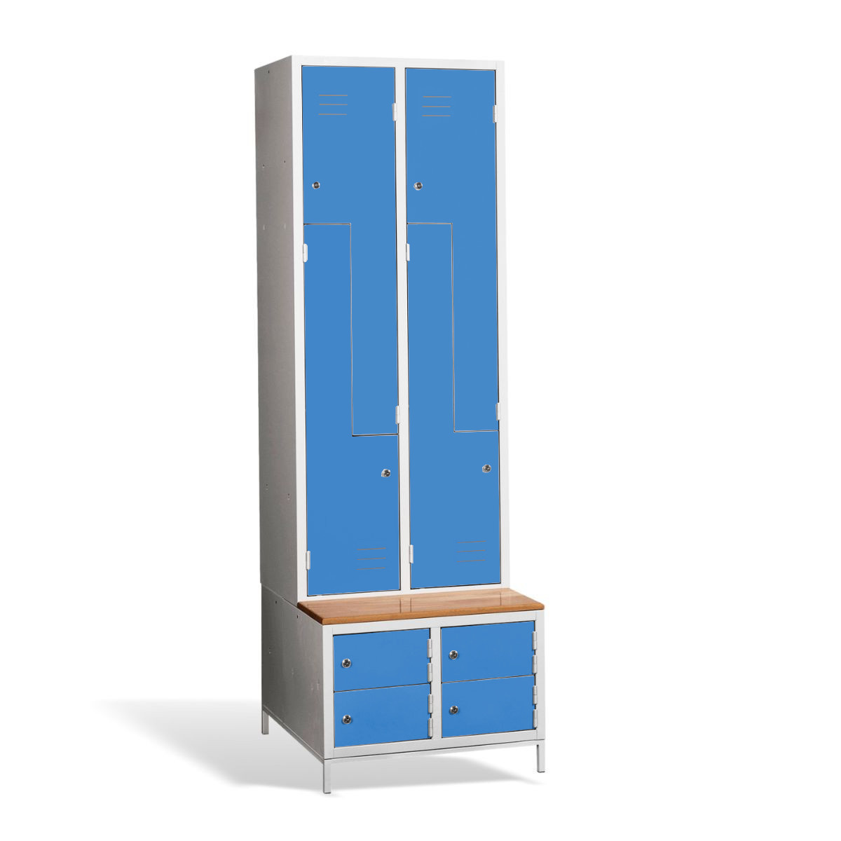 Die Metallgarderobe #03 CIK-CAK MINI 4 PLUS bietet eine 3-in-1-Lösung. Sie bietet Stauraum für Ihre persönlichen Gegenstände und Mäntel in Form von 4 Fächern, ist mit einer eingebauten Bank ausgestattet, unter der sich auch Schuhfächer für mehr Komfort und Sauberkeit finden. Die Konstruktion des Schranks ist geschweißt und besteht aus beschichtetem Stahlblech der Güteklasse 1. Das Z-förmige Design des Kleiderschranks ist platzsparend und bietet dennoch reichlich Komfort. Dieser Schrank ist die ideale Wahl für einen Umkleideraum in einer Schule, einem Unternehmen oder einer Sporteinrichtung. Der #03 CIK-CAK MINI 4 PLUS wird standardmäßig mit einem Sicherheitszylinderschloss geliefert, aber Sie können aus einer Vielzahl von Schlössern wählen, die Ihren Anforderungen entsprechen.