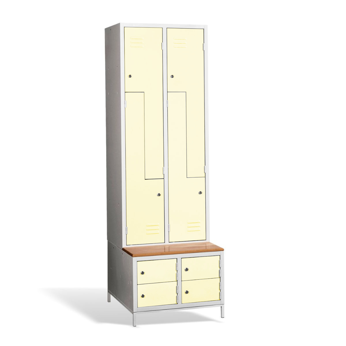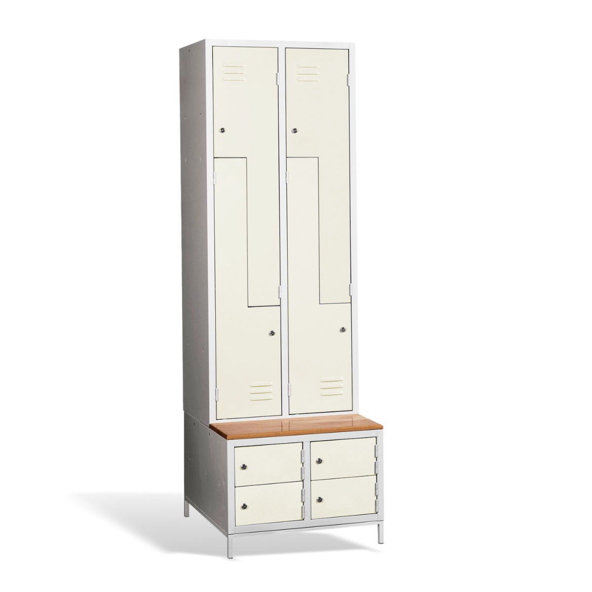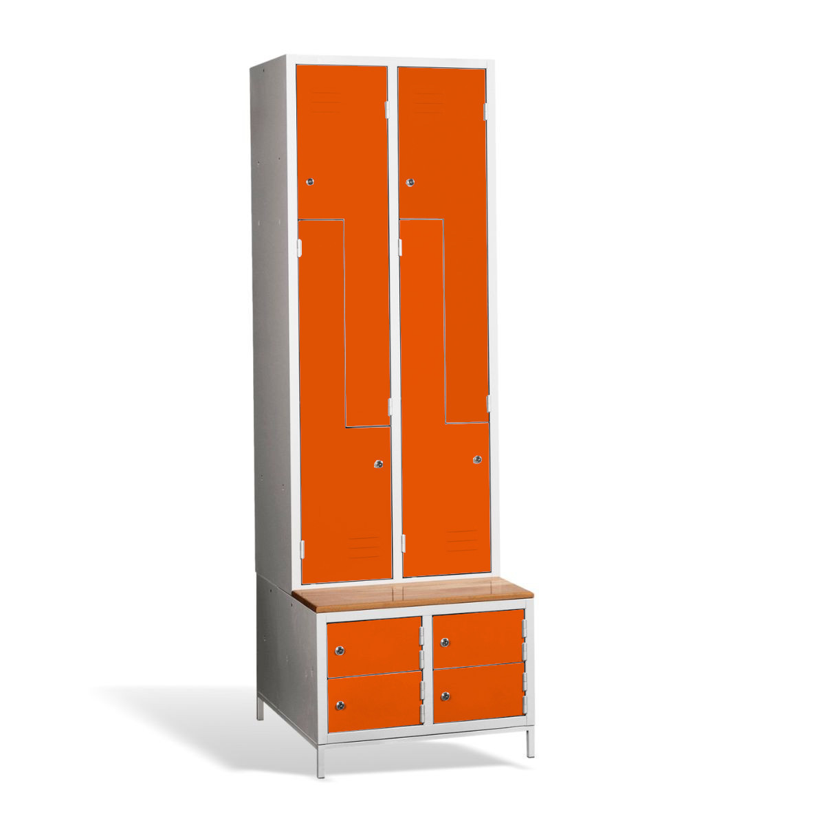 Die Metallgarderobe #03 CIK-CAK MINI 4 PLUS bietet eine 3-in-1-Lösung. Sie bietet Stauraum für Ihre persönlichen Gegenstände und Mäntel in Form von 4 Fächern, ist mit einer eingebauten Bank ausgestattet, unter der sich auch Schuhfächer für mehr Komfort und Sauberkeit finden. Die Konstruktion des Schranks ist geschweißt und besteht aus beschichtetem Stahlblech der Güteklasse 1. Das Z-förmige Design des Kleiderschranks ist platzsparend und bietet dennoch reichlich Komfort. Dieser Schrank ist die ideale Wahl für einen Umkleideraum in einer Schule, einem Unternehmen oder einer Sporteinrichtung. Der #03 CIK-CAK MINI 4 PLUS wird standardmäßig mit einem Sicherheitszylinderschloss geliefert, aber Sie können aus einer Vielzahl von Schlössern wählen, die Ihren Anforderungen entsprechen.