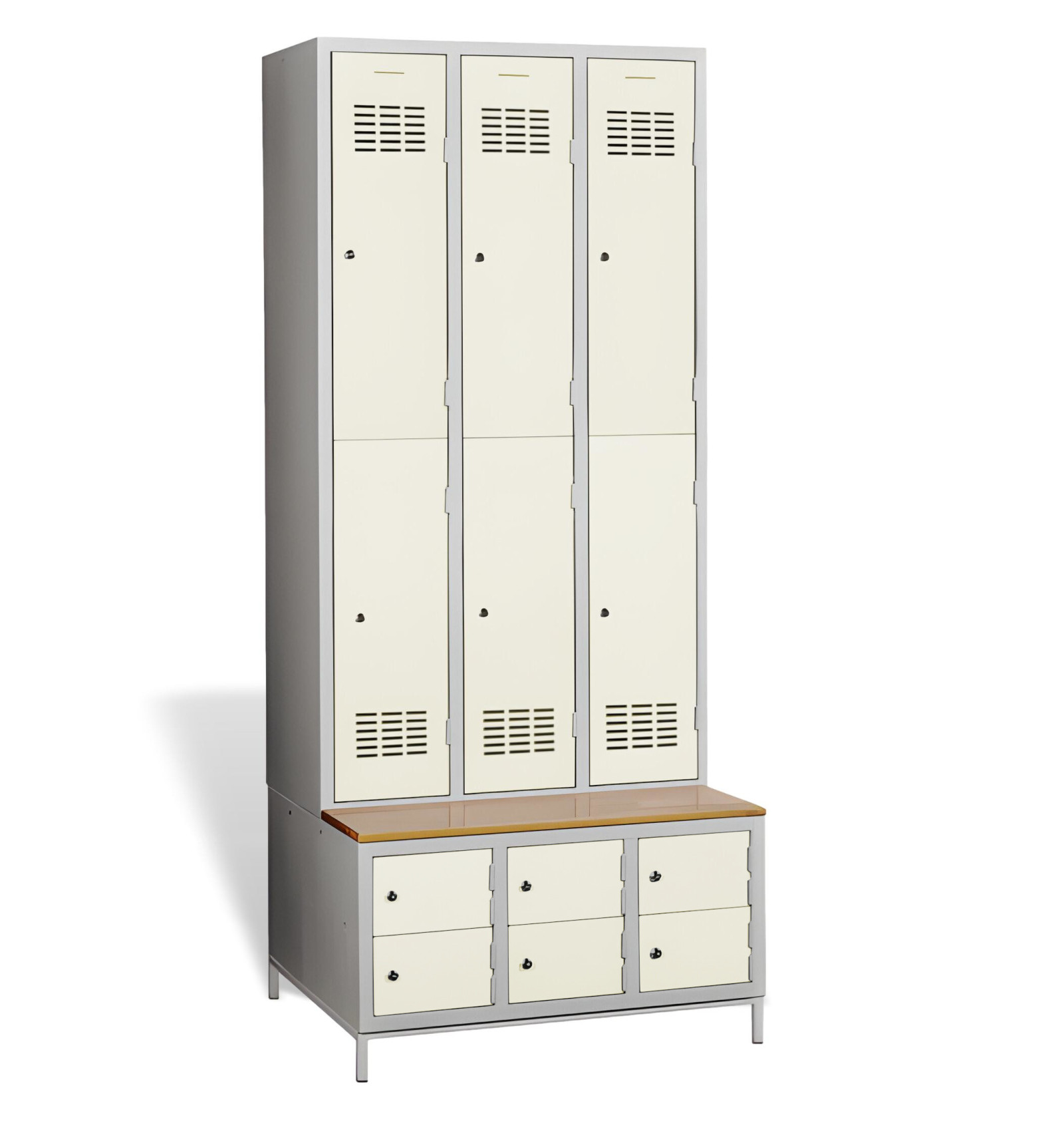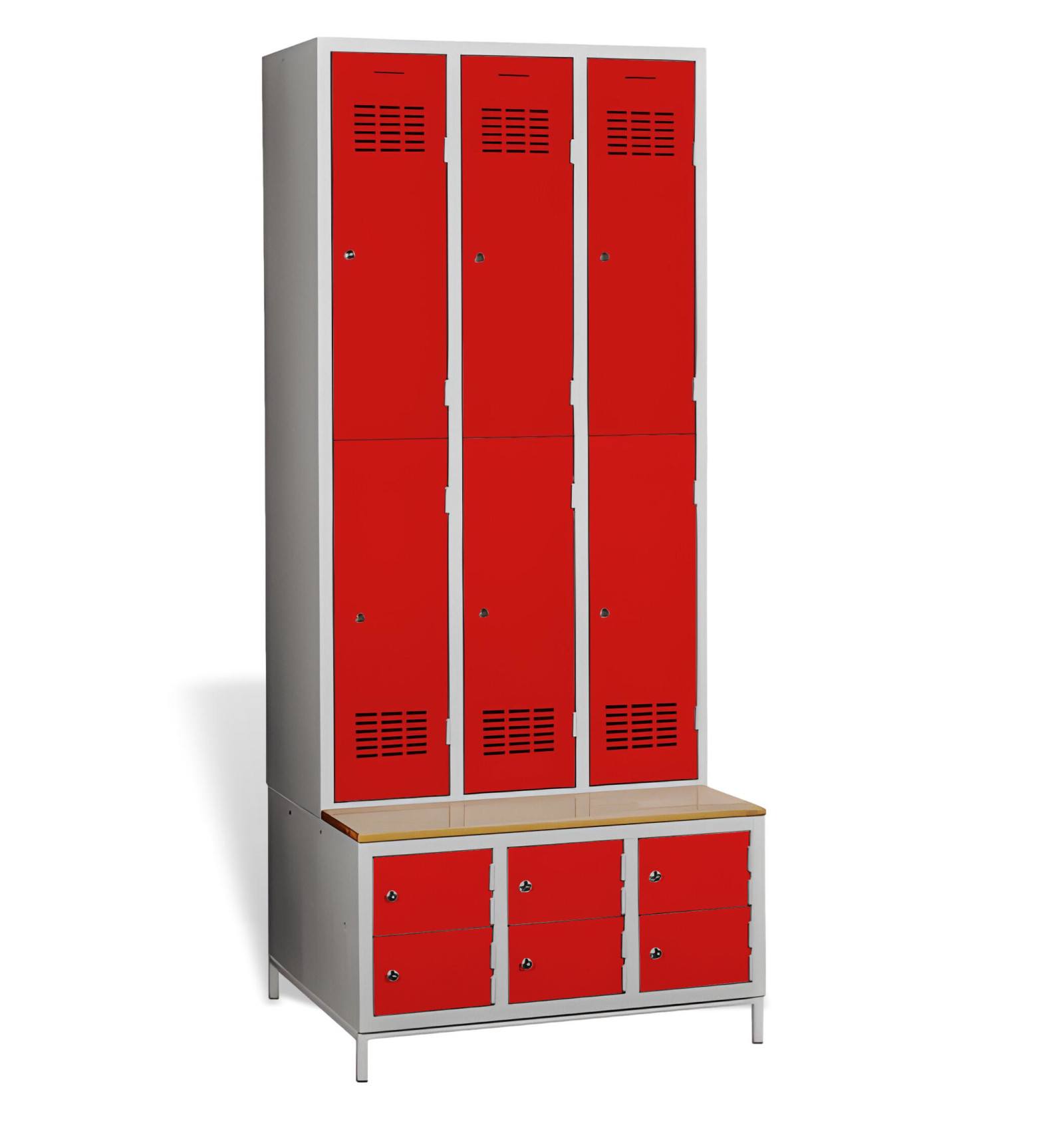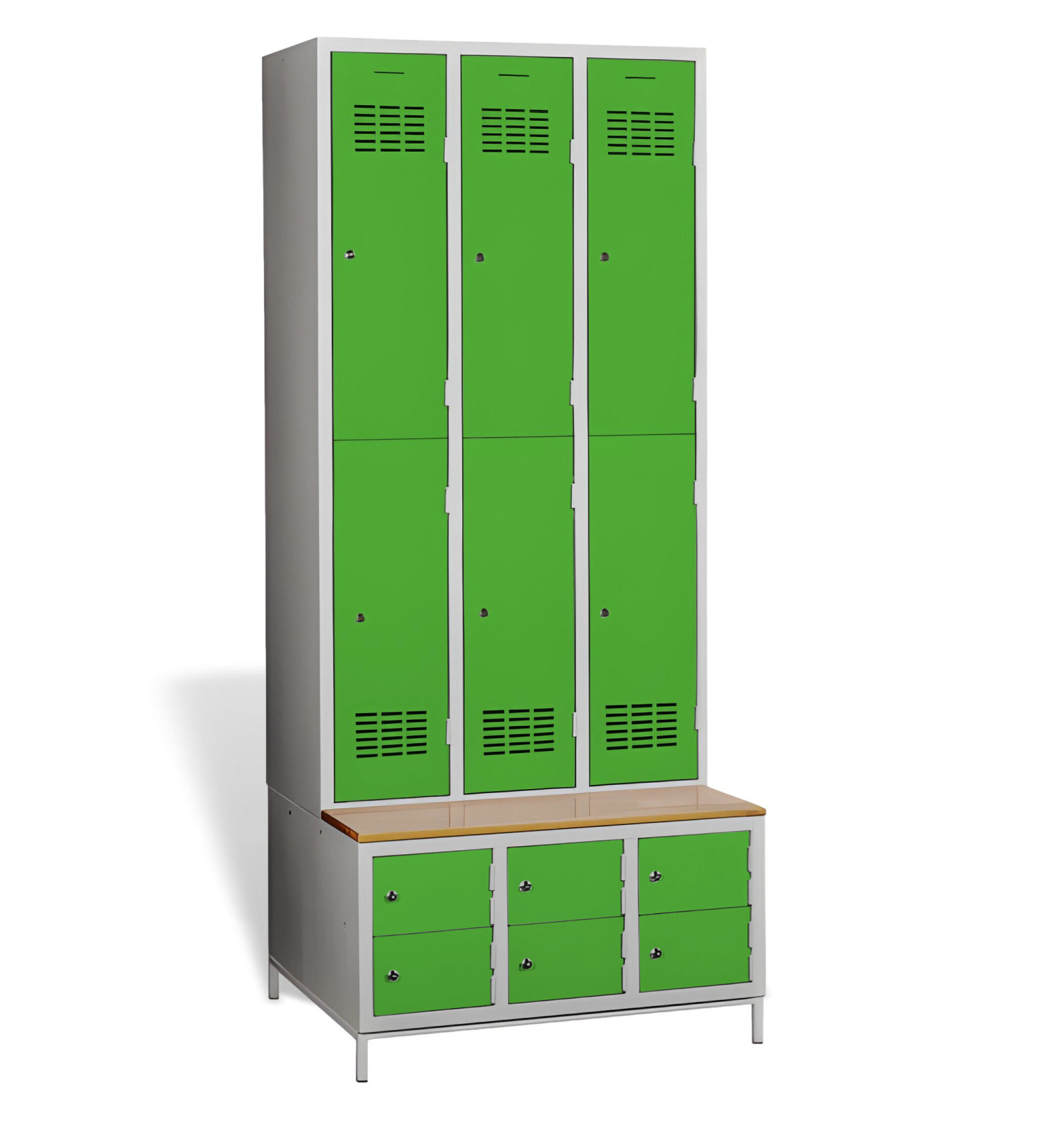 Der 6-türige Umkleideschrank ist die perfekte Wahl für jede Garderobe, da er eine All-inclusive-Lösung bietet. Er verfügt über kurze Türen und bietet dadurch getrennten Stauraum für 6 Personen, während er dank seiner Breite von nur 900 mm wenig Platz einnimmt. Eine eingebaute Sitzbank sorgt für mehr Komfort beim Umziehen, und ein separater Schuhschrank trägt zur Sauberkeit und Ordnung bei. Die Konstruktion des Schranks ist geschweißt und besteht aus beschichtetem Stahlblech der Güteklasse 1. Der #03 MINI 6 PLUS wird standardmäßig mit einem Sicherheitszylinderschloss geliefert, aber Sie können aus einer Vielzahl von Schlössern wählen, die Ihren Anforderungen entsprechen.