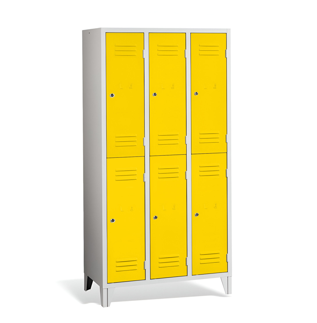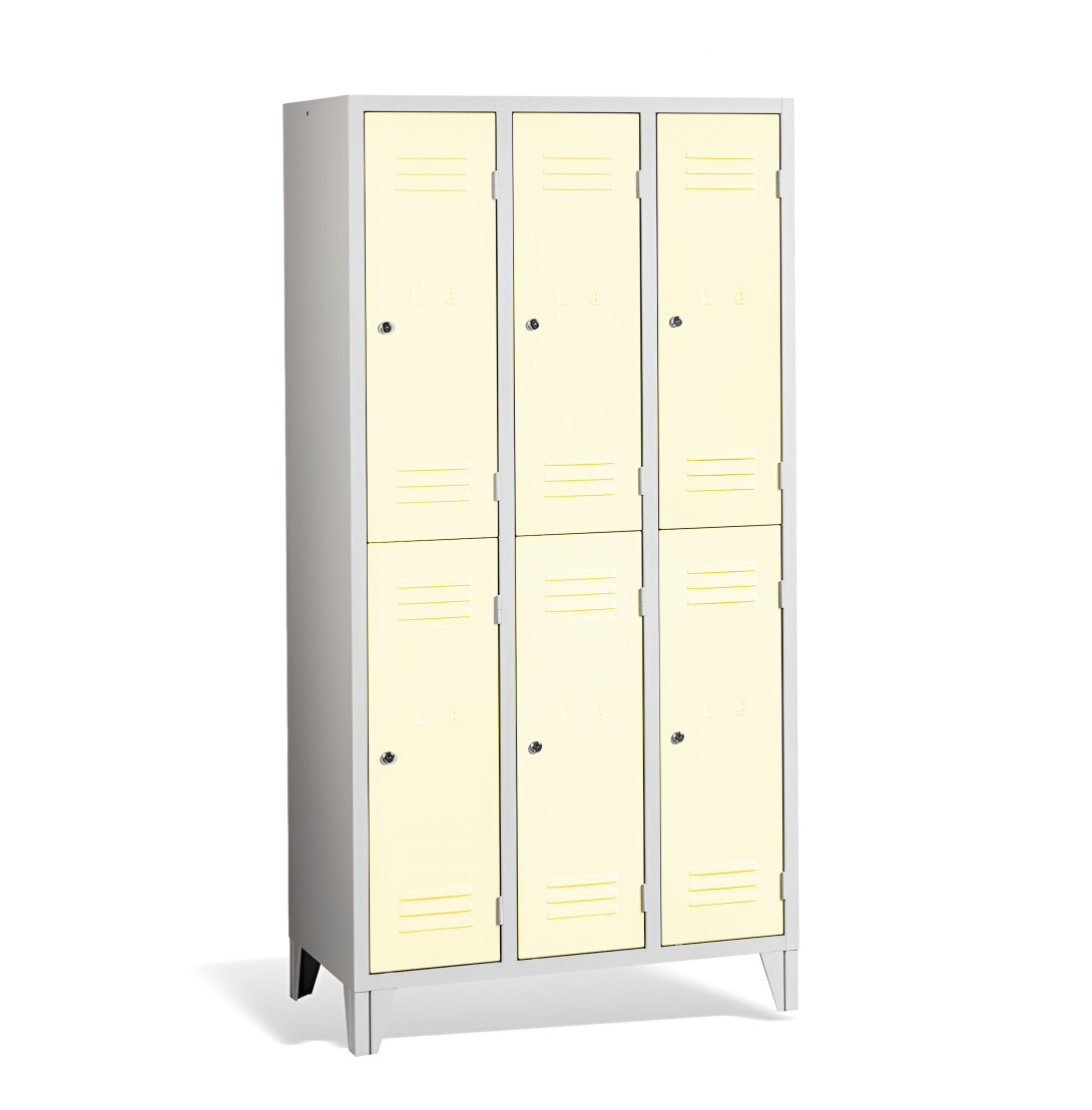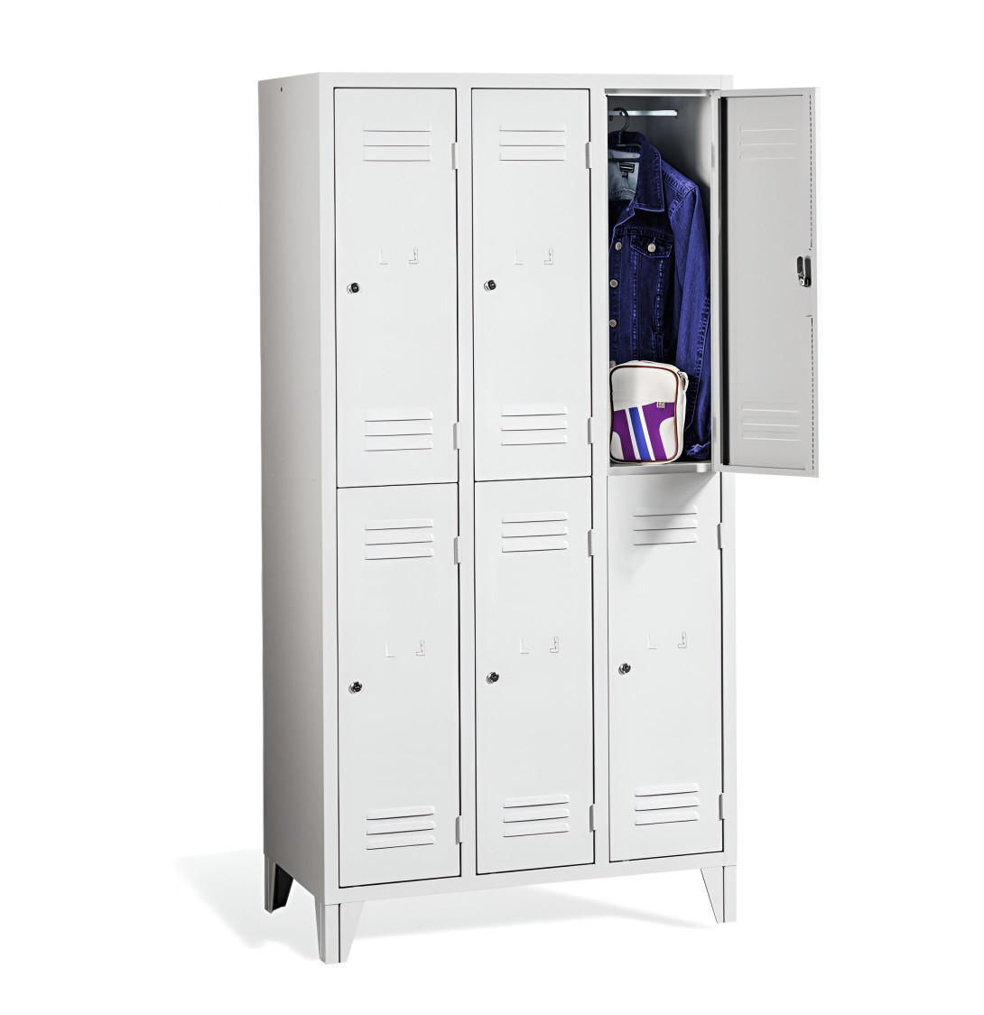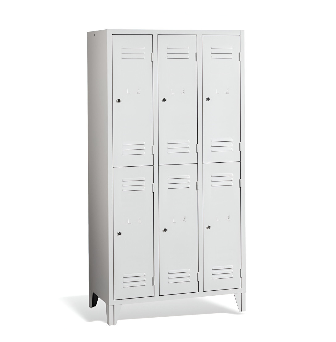 Der 6-türige Garderobenschrank mit kurzen Türen und Füßen #26 MINI 6 ECONOMY F ist eine preisgünstige Lösung für Schulen, Unternehmen und andere Einrichtungen. Er bietet 6 separate Fächer für 6 Personen und benötigt nur wenig Platz. Der Schrank bietet ausreichend Stauraum für Mäntel, Schuhe und persönliche Gegenstände. Es besteht aus hochwertigem Stahlblech erster Klasse mit Oberflächenbehandlung, was eine lange Lebensdauer gewährleistet. Die Belüftung im oberen und unteren Teil der Türen sorgt für eine effiziente Luftzirkulation und leitet Gerüche ab. Die Füße mit einer Höhe von 120 mm ermöglichen eine einfache Reinigung unter dem Schrank. Standardmäßig wird der Schrank mit einem Sicherheitszylinderschloss geliefert, auf Wunsch sind jedoch auch andere Schlossvarianten erhältlich.