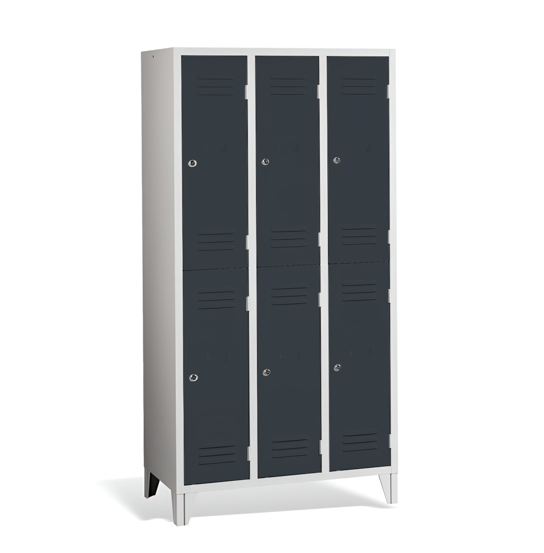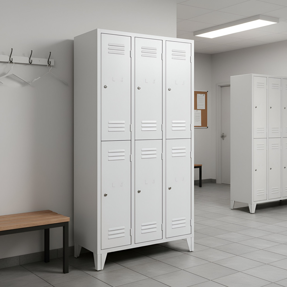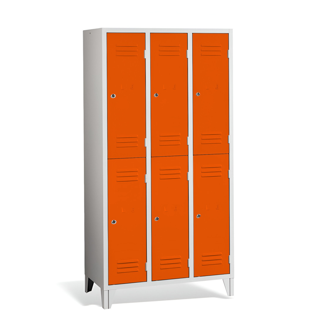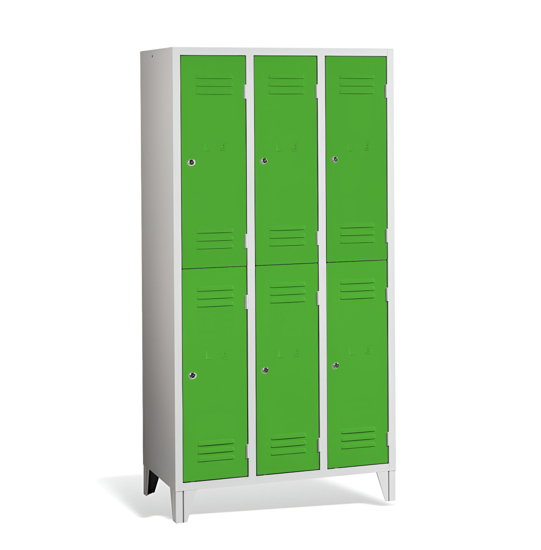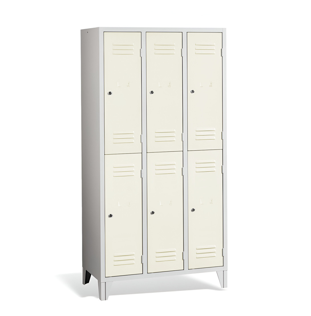 Der 6-türige Garderobenschrank mit kurzen Türen und Füßen #26 MINI 6 ECONOMY F ist eine preisgünstige Lösung für Schulen, Unternehmen und andere Einrichtungen. Er bietet 6 separate Fächer für 6 Personen und benötigt nur wenig Platz. Der Schrank bietet ausreichend Stauraum für Mäntel, Schuhe und persönliche Gegenstände. Es besteht aus hochwertigem Stahlblech erster Klasse mit Oberflächenbehandlung, was eine lange Lebensdauer gewährleistet. Die Belüftung im oberen und unteren Teil der Türen sorgt für eine effiziente Luftzirkulation und leitet Gerüche ab. Die Füße mit einer Höhe von 120 mm ermöglichen eine einfache Reinigung unter dem Schrank. Standardmäßig wird der Schrank mit einem Sicherheitszylinderschloss geliefert, auf Wunsch sind jedoch auch andere Schlossvarianten erhältlich.