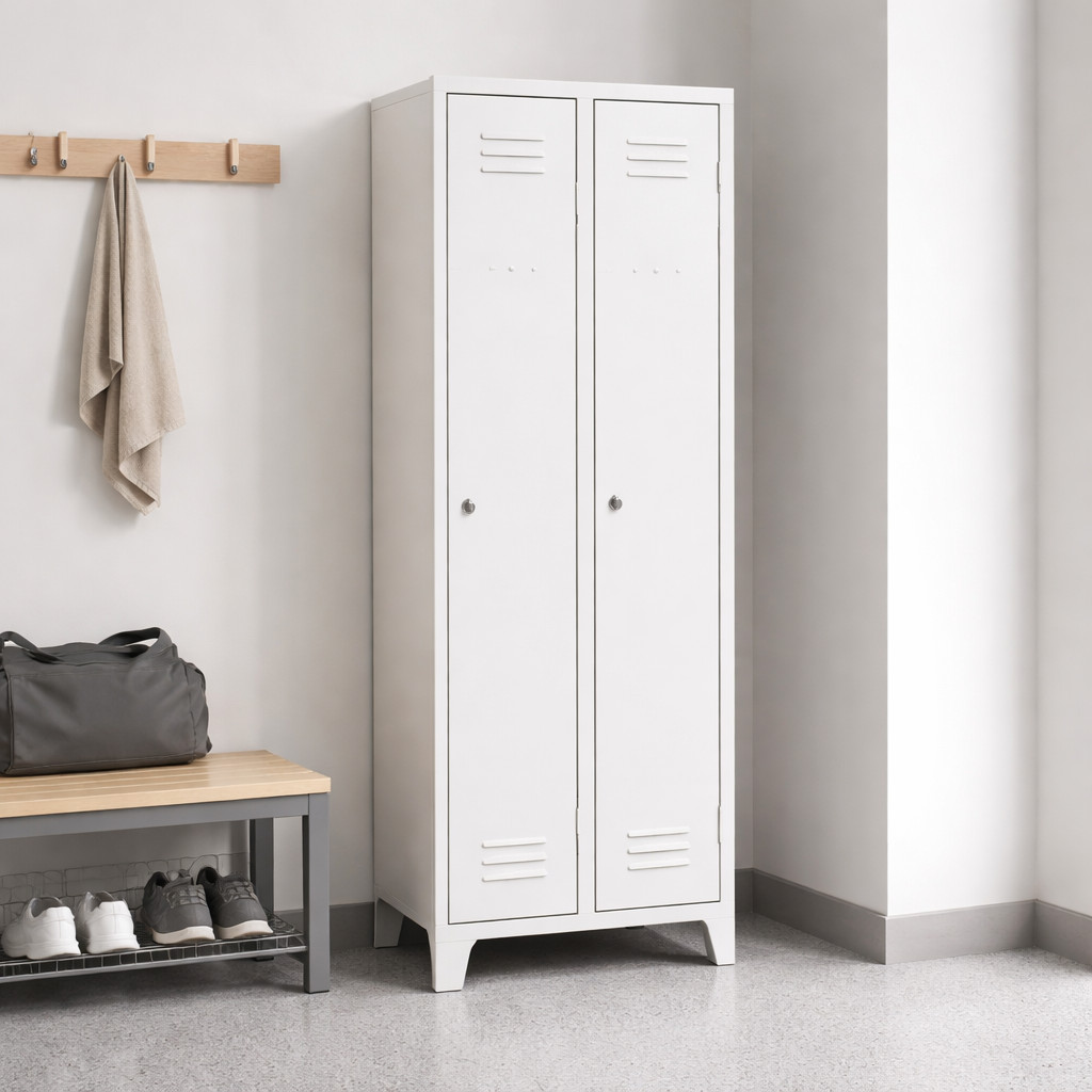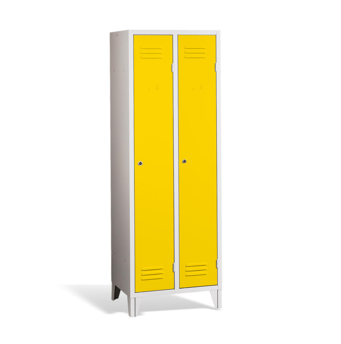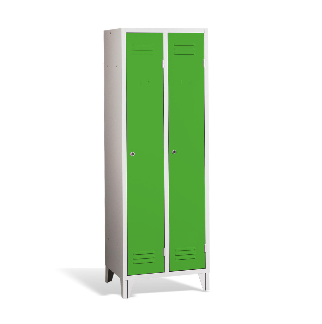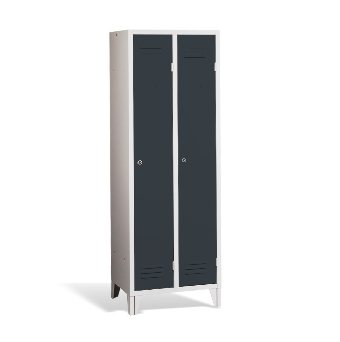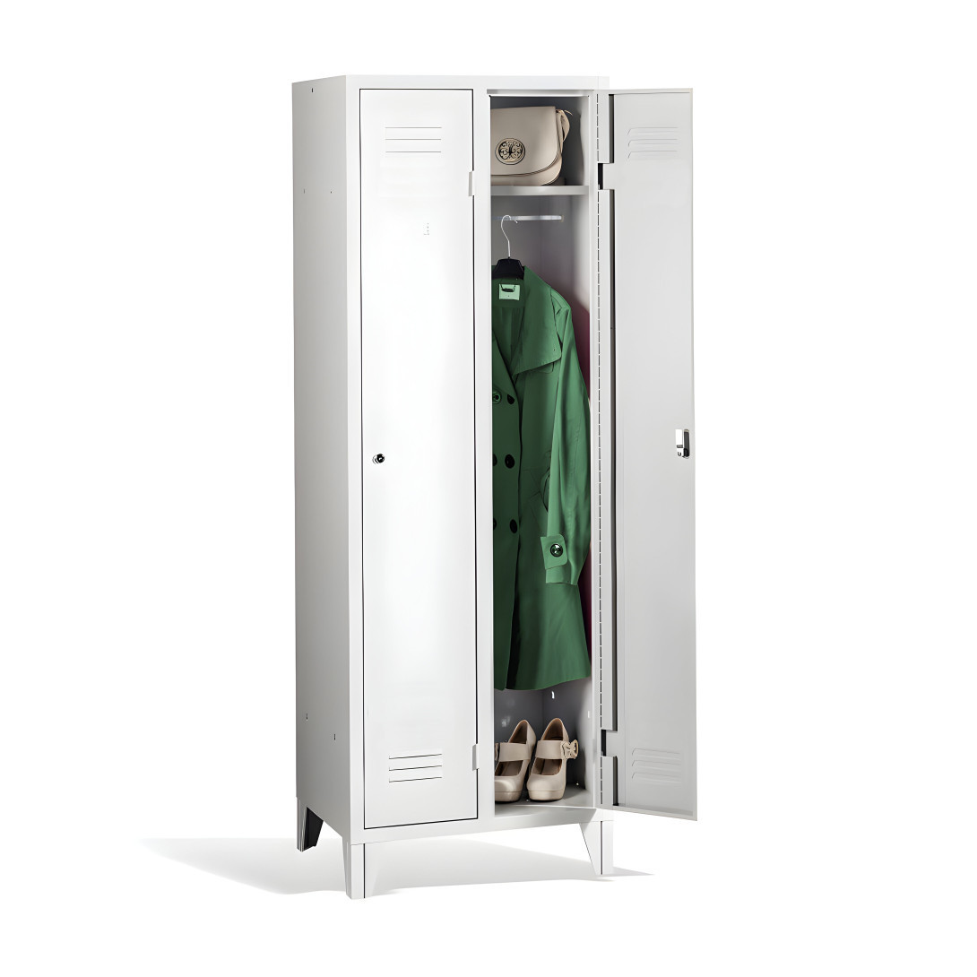 Der 2-türige Garderobenschrank mit Füßen #26 STANDARD 2 ECONOMY F ist eine preisgünstige Lösung für Schulen, Unternehmen und andere Einrichtungen. Er verfügt über lange Türen, die ausreichend Platz für Ihre Mäntel, Schuhe und persönlichen Gegenstände bietet. Es besteht aus hochwertigem Stahlblech erster Klasse mit Oberflächenbehandlung, die eine lange Lebensdauer gewährleistet. Die Belüftung im oberen und unteren Teil der Türen sorgt für eine effiziente Luftzirkulation und leitet Gerüche ab. Die Füße haben eine Höhe von 120 mm, was eine bequeme Reinigung unter Schränken ermöglicht. Standardmäßig wird es mit einem Sicherheitszylinderschloss geliefert, auf Wunsch sind jedoch auch verschiedene andere Schlossvarianten erhältlich.