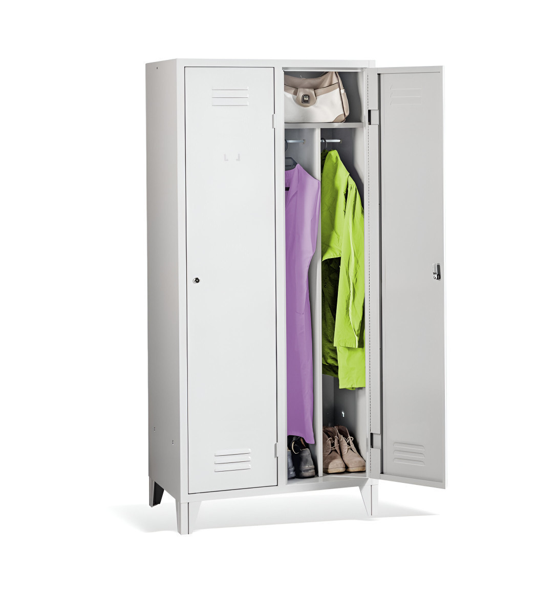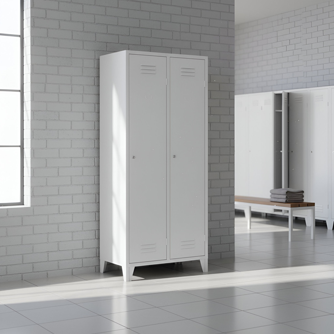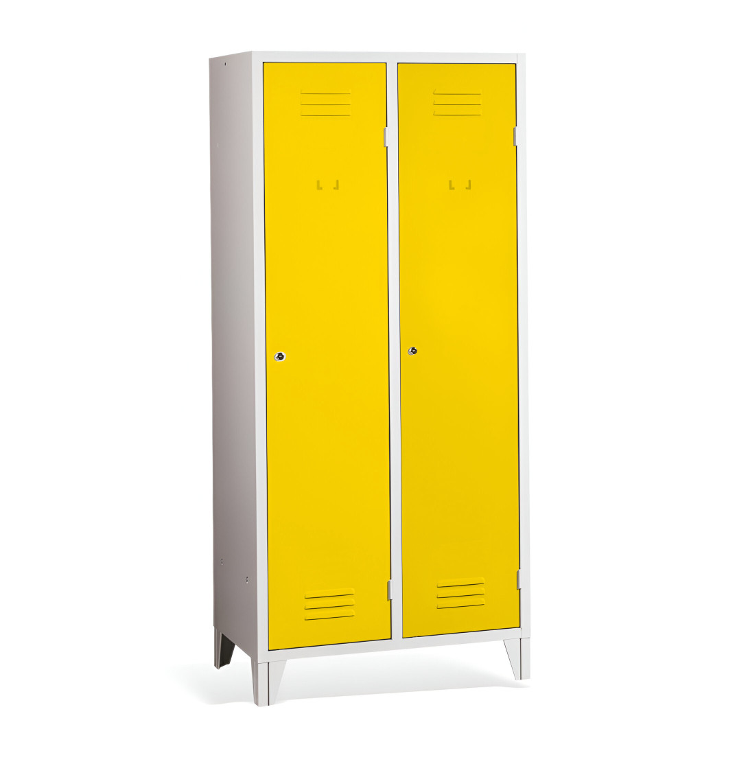 Der 2-türige Spind mit Trennwand und Füßen #26 MAXI 2 ECONOMY F ist eine preisgünstige Lösung für Schulen, Unternehmen und andere Institutionen. Es ist die perfekte Wahl für Umkleideräume, da es ausreichend Platz für Ihre Mäntel, Schuhe und persönlichen Gegenstände bietet. Der Schrank enthält eine Trennwand, die das Innere des Schranks in 2 Fächer unterteilt. Dadurch eignet sich dieser Garderobeschrank ideal zur Trennung von Arbeits- und Zivilkleidung trennen, was in vielen Arbeitsplätzen erforderlich ist.