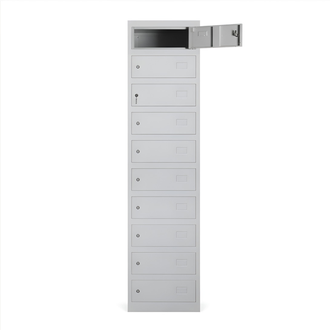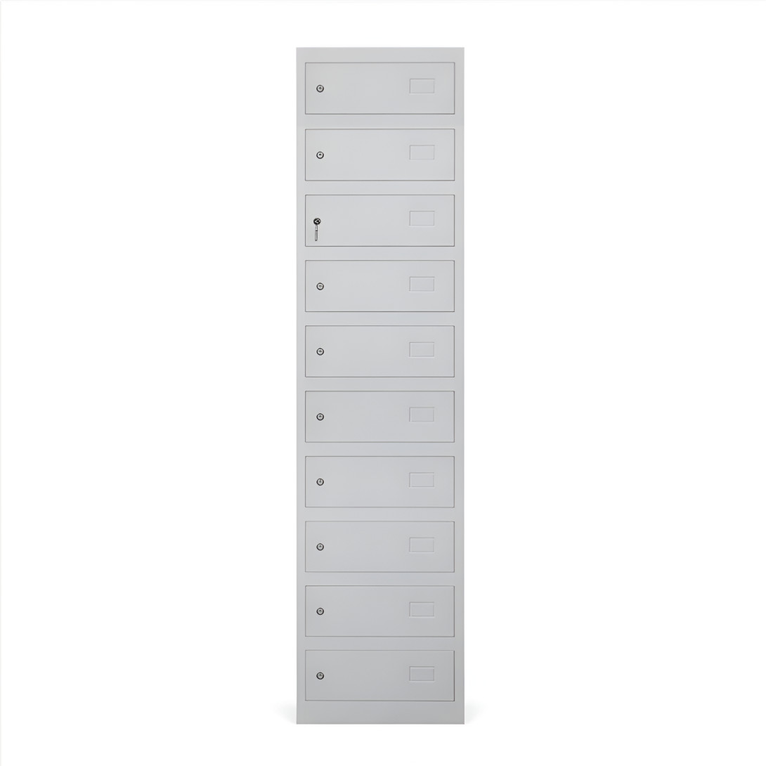 Der Schrank verfügt über 10 separate Fächer, die einen getrennten Stauraum für mehrere Nutzer bieten. Diese Lösung eignet sich besonders für Bereiche, in denen eine sichere und organisierte Aufbewahrung persönlicher Gegenstände erforderlich ist.
