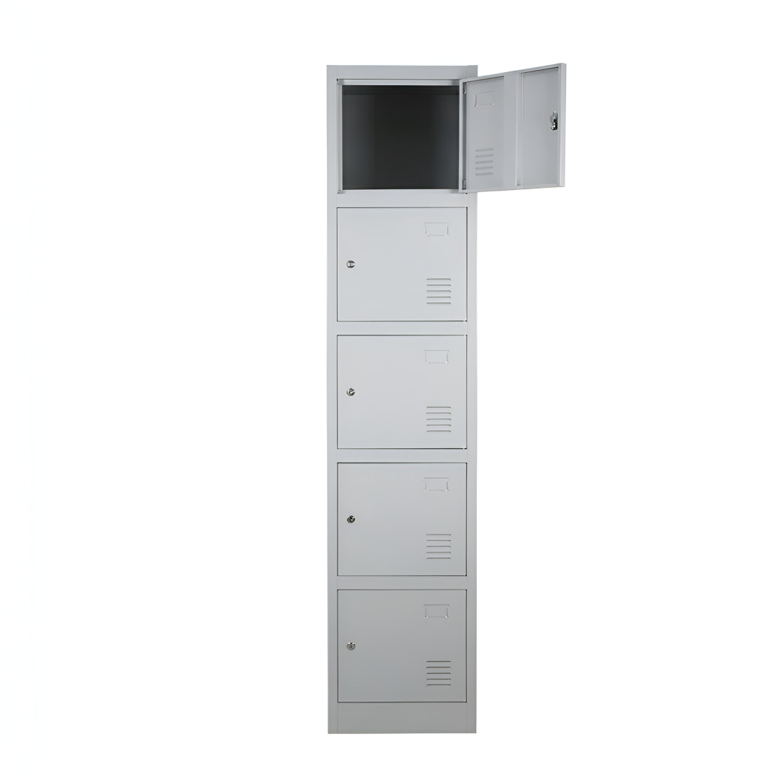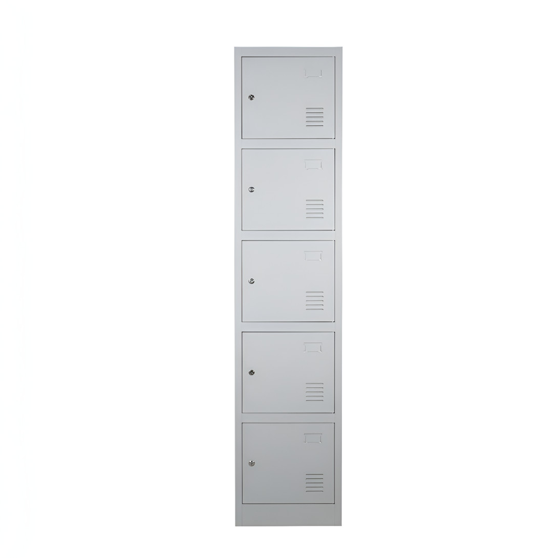 Die Konstruktion des Schranks ist in 5 separate Fächer unterteilt, die eine praktische Organisation und sichere Aufbewahrung persönlicher Gegenstände ermöglichen. Diese Lösung eignet sich besonders dort, wo Gegenstände übersichtlich getrennt und vor unbefugtem Zugriff geschützt werden müssen.