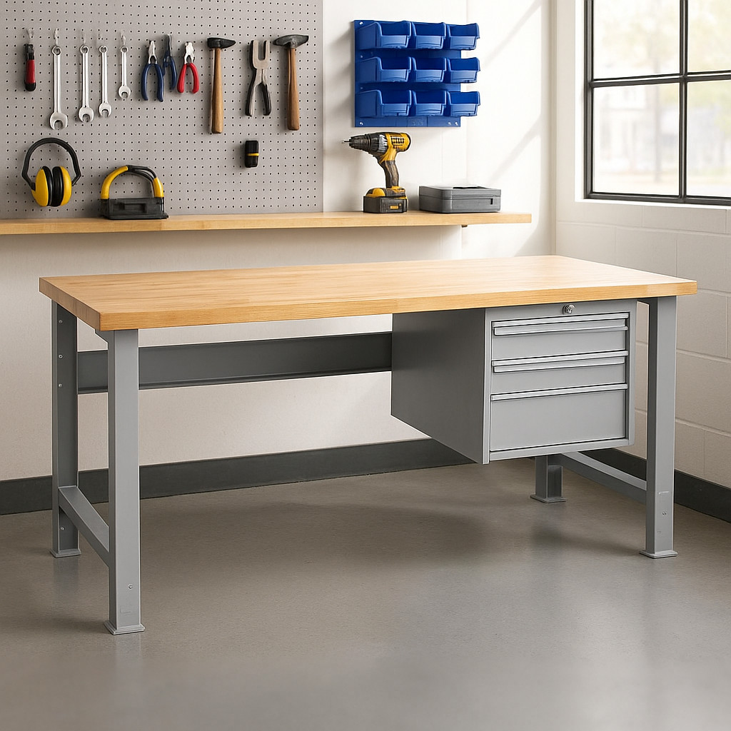 Dieser robuste Arbeitstisch ist die ideale Lösung für Werkstätten, Produktions- und Servicebereiche, in denen Stabilität, Flexibilität und eine sichere Aufbewahrung von Werkzeugen erforderlich sind. Die 40 mm starke und 1700 mm lange Arbeitsplatte aus Buche bietet eine stabile und widerstandsfähige Oberfläche, auch für anspruchsvolle Aufgaben.