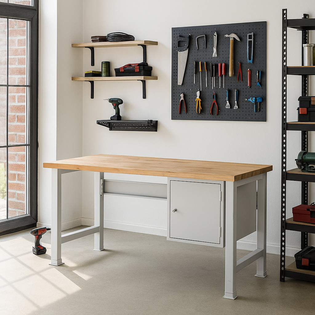 Dieser robuste Arbeitstisch ist die ideale Lösung für Werkstätten, Produktions- und Servicebereiche, wo Festigkeit, Flexibilität und praktischer Stauraum gefragt sind. Die Buchen-Arbeitsplatte mit einer Stärke von 40 mm und einer Länge von 1500 mm bietet eine stabile Arbeitsfläche, die auch anspruchsvollen Aufgaben standhält. Verstellbare Metallbeine aus Stahlblech (2,5 – 3,0 mm) sorgen für Stabilität und lange Lebensdauer und ermöglichen es, die Höhe des Tisches individuell an die Bedürfnisse des Benutzers anzupassen, wodurch komfortable Arbeitsbedingungen im Sitzen wie im Stehen gewährleistet werden.