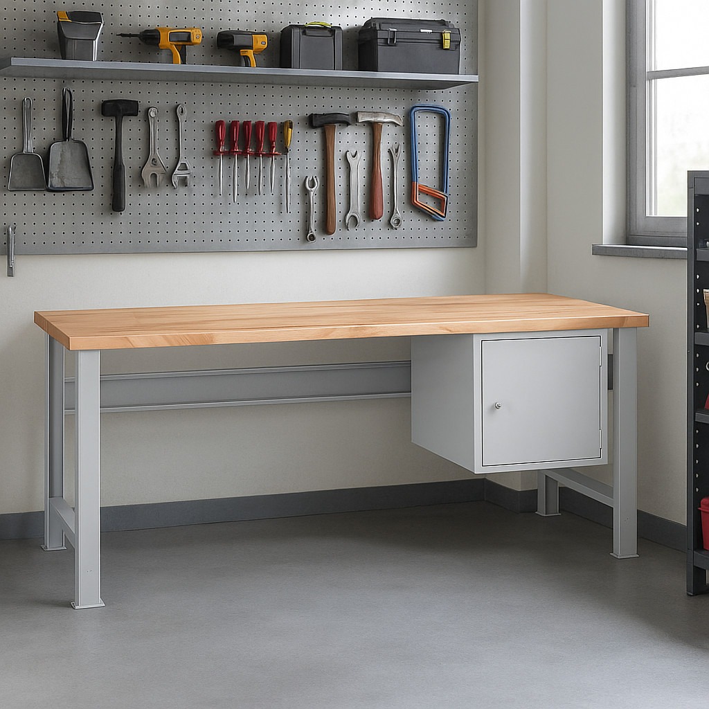 Zum Tisch gehört ein praktischer 1-türiger Schrank aus Stahlblech mit einer Stärke von 0,7 – 0,8 mm, ausgestattet mit zwei Fachböden für die übersichtliche und sichere Aufbewahrung von Werkzeugen oder Materialien. Dank des Zylinderschlosses bleibt der Inhalt des Schranks stets geschützt.
