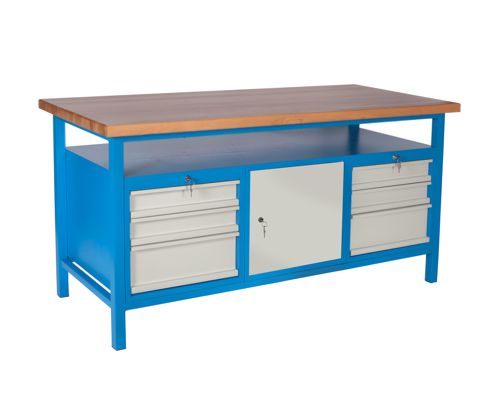 Die Werkbank #08 HARDWORK DCD mit einer Tragfähigkeit bis 500 kg ist ein toller Helfer in jeder Werkstatt, Garage oder Lagerhalle. Die Werkbank ist massiv und stabil und für den anspruchsvollen Einsatz in Industrie und Handwerk konzipiert. Seine geschweißte Stahlkonstruktion ist sehr stabil und langlebig. Die Werkbank besteht aus einer Arbeitsplatte aus hochwertigem verleimtem Fichtenholz, beidseitig furniert mit Buchensperrholz mit einer Stärke von 40 mm. Tischbeine bestehen aus geschlossenen Stahlprofilen 40 x 40 mm. Die Stahlkonstruktion dieser Werkbank ist himmelblau, die Türen und Einlegeböden sind hellgrau.